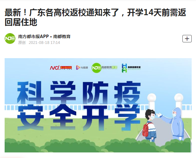 8月16日,广州大学官微发布开学返校指引。指引要求,开学前14天减少非必要流动,所有在校外学生(仍在中高风险地区的学生除外)开学前14天务必返回居住地,持续按要求每天进行健康打卡。