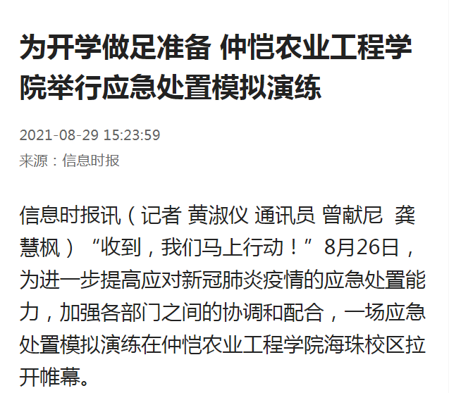 一个小时左右的疫情防控模拟演练背后,仲恺农业工程学院为开学做足准备。学校制定详细的演练方案,同时动态调整完善日常疫情防控制度。对于每一位申请返校的学生,学校都确保精准掌握其具体情况,包括学生连续14天健康打卡记录、48小时以内核酸检测结果、健康码及行程卡,以备进校查验。学生持有以上返校“四件套”,在入校当天校门体温检测正常的情况下,方可顺利入校。