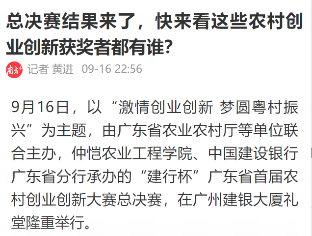 9月16日,以“激情创业创新 梦圆粤村振兴”为主题,由广东省农业农村厅等单位联合主办,仲恺农业工程学院、中国建设银行广东省分行承办的“建行杯”广东省首届农村创业创新大赛总决赛,在广州建银大厦礼堂隆重举行。