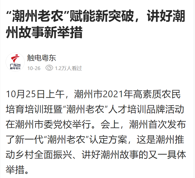 今年以来,为促进潮州新一代农人传承“潮州老农”的农业工匠精神,发挥新时代农民在乡村振兴发展中的重要人才支撑作用,潮州市委、市政府坚持聚焦乡村振兴和现代农业发展人才需求,致力打造一批精勤、自信、求变、奉献的农业技术能手,通过推出“潮州老农”乡村人才振兴品牌,弘扬“老潮农”工匠精神优良传统,激发“小潮农”振兴乡村奋斗热情,催生出农业农村发展新的内生动力。
