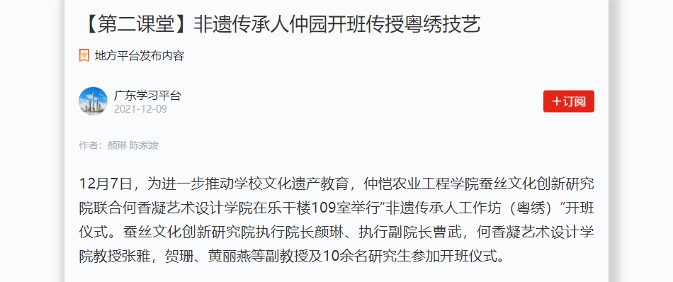 12月7日,为进一步推动学校文化遗产教育,仲恺农业工程学院蚕丝文化创新研究院联合何香凝艺术设计学院在乐干楼109室举行“非遗传承人工作坊(粤绣)”开班仪式。蚕丝文化创新研究院执行院长颜琳、执行副院长曹武,何香凝艺术设计学院教授张雅,贺珊、黄丽燕等副教授及10余名研究生参加开班仪式。