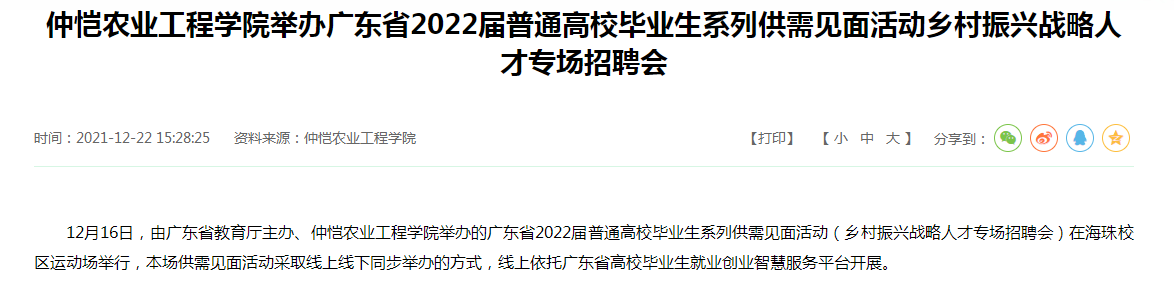 12月16日,由广东省教育厅主办、仲恺农业工程学院举办的广东省2022届普通高校毕业生系列供需见面活动(乡村振兴战略人才专场招聘会)在海珠校区运动场举行,本场供需见面活动采取线上线下同步举办的方式,线上依托广东省高校毕业生就业创业智慧服务平台开展。
