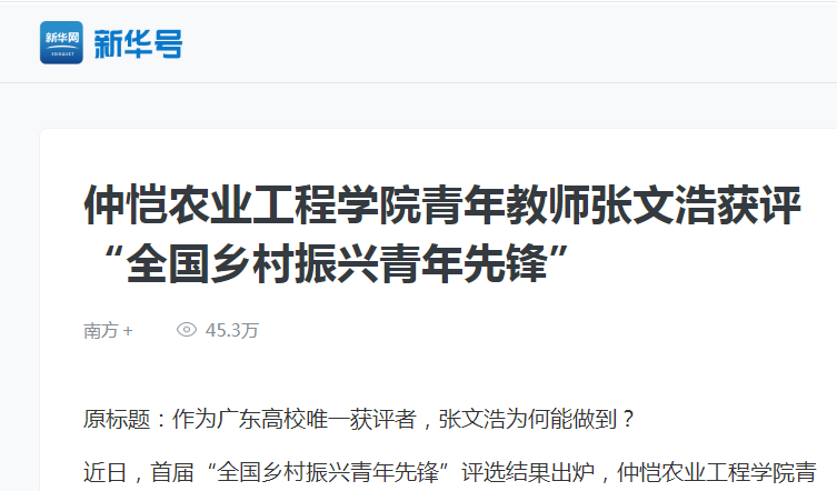 近日,首届“全国乡村振兴青年先锋”评选结果出炉,仲恺农业工程学院青年教师张文浩脱颖而出,成为广东高校的唯一获评者。