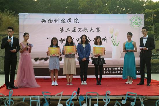 12月1日,动物科技学院第二届“想把我唱给你听”K歌大赛在白云校区新篮球场举行。辅导员沈洁老师、动科院学生组织代表和校组织代表出席本次大赛。评委由顽石乐队成员施力汛、校合唱队副队长陈谦以及动科院第一届K赛获奖者八晓敏担任。