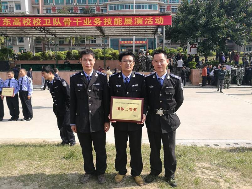 11月28日--30日,广东省教育厅在佛山市南海区青少年军校开展全省高校校卫队骨干业务技能展演活动。此次比赛全省共有146所高校438人参加,我校高度重视,挑选出素质高、能力强的校卫队员代表积极备战参赛。在为期半个月的强化训练中,队员们昼夜训练、挥洒汗水,力求将最佳状态带到赛场。保卫处选派张正明副科长带领曾令畅、黄佳两名队员在比赛中一展我校校卫队风采,荣获总分第六名、团体二等奖和急救(心肺复苏)个人项目第二名的佳绩,为学校在省级赛场上再添光彩。