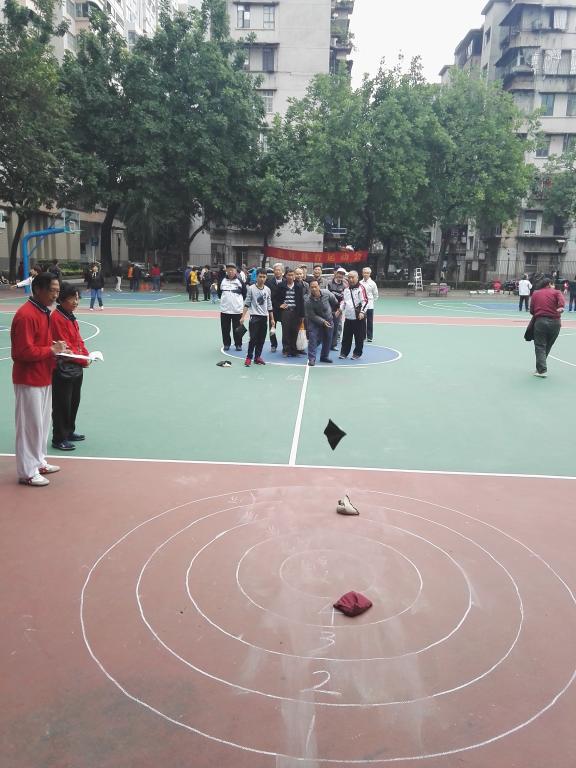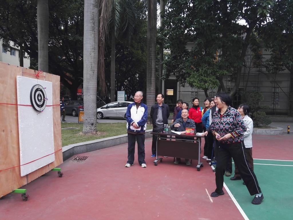 老年运动会以趣味、娱乐、参与为主题,共设抛圆圈、足球射门、投篮、滚球撞物、抛沙包、打门球、掷飞镖等7个室外项目以及乒乓球、麻将两个室内项目,老同志们玩得不亦乐乎。