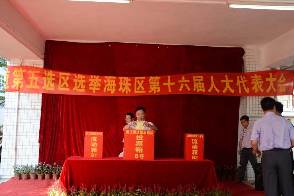 高志青出席在白云校区刘宇新楼一楼举行的广州市海珠区第十六届人大代表大会第五选区投票选举活动。主持人介绍本选区基本情况;宣读相关选举文件;公布监票人、计票人和选举工作人员名单;宣读选举投票的注意事项。随后,高志青带领大家排队,整齐有序地开始投票。