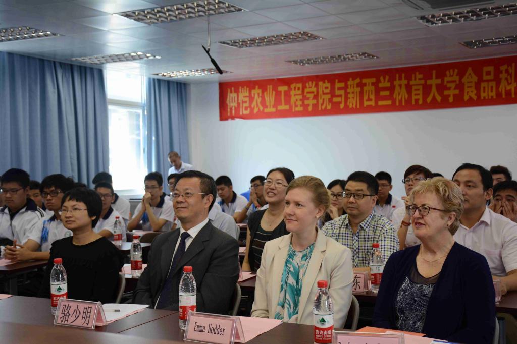 9月13日上午,仲恺农业工程学院与新西兰林肯大学食品科学与工程“3+2”本硕连读国际班(以下简称国际班)开学典礼在白云校区曾宪梓楼顺利举行。校长骆少明,新西兰驻广州总领事馆副总领事Ms.Emma Hodder,华南∕西南区及香港、澳门地区教育经理叶方珉,新西兰驻广州总领事馆政策顾问曾淑玲,林肯大学大学学习和语言部主任、学术委员会主席、学术质量代理主任Dr.Lorraine Petelo,林肯大学大中华地区孙主任,广东省教育厅交流合作处周柳余女士出席典礼。轻工食品学院院长白卫东、党总支书记廖起彬、副院长刘功良、外事处处长姚圣梅、教务处处长王健敏、国际班师生及学生家长参加本次典礼。
