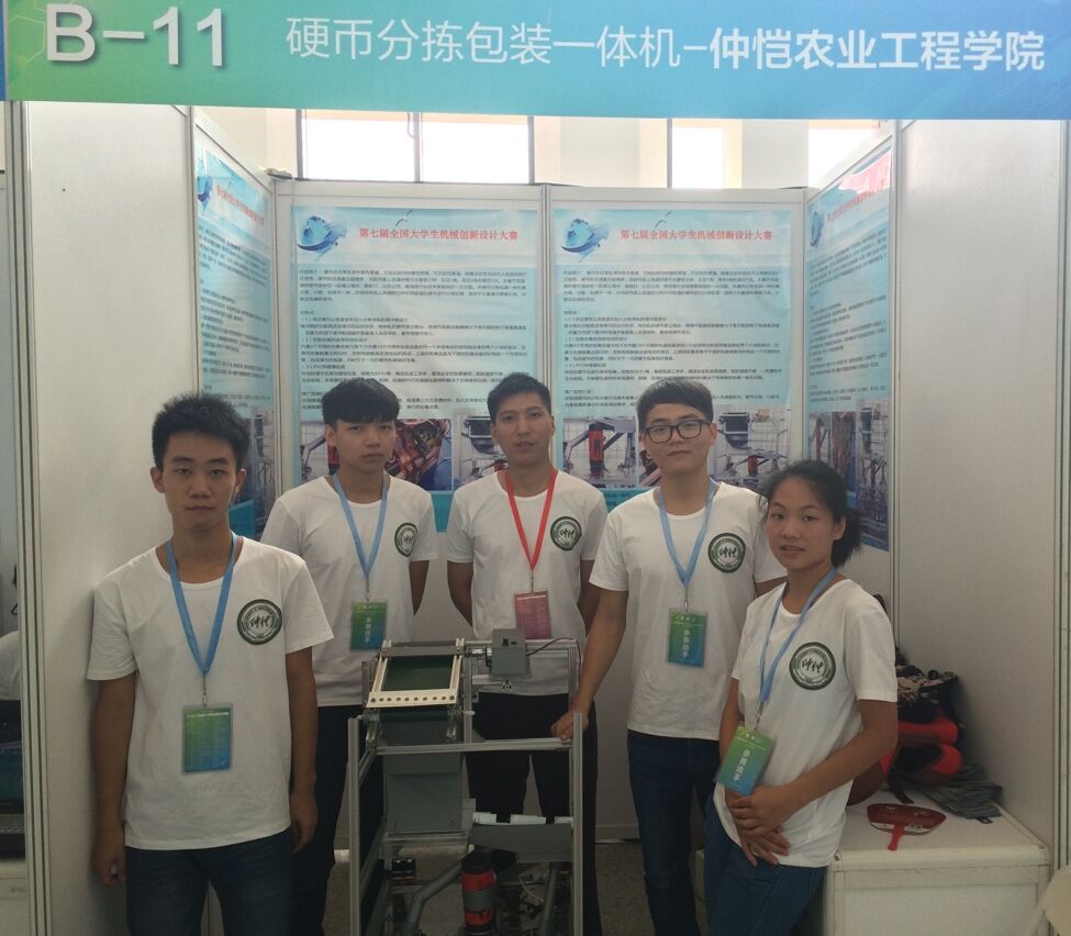 此次参赛作品团队由机电工程学院2013级学生江楚贤、李棋峰、谢倾佳和沈素冰四位同学组成,该院张日红副教授任指导老师。参赛团队自2015年11月组建以来就着手进行作品的设计构思与加工调试,作品《硬币分拣包装一体机》 于2016年5月8日在广东省赛区第一阶段的比赛中获得一等奖(1/15),2016年6月3至5日在湖南大学经过初评委员会的评审,获得了参加全国决赛第二阶段的参赛资格(1/4)。在广东赛区的第一阶段比赛结束后,参赛团队开始积极针对第一阶段比赛中专家提出的意见与建议进行了认真研讨,对作品进行了为期两个多月的改进设计与加工调试,并进行了相应的发明专利申请。该作品运行过程高效、可靠,有效解决了当前银行、公交公司、商场等部门清点硬币花费大量人工、时间和成本的问题。在此次决赛中,经过现场产品演示、PPT汇报、现场答辩三轮激烈角逐,我校代表队以其独特的构思和精巧的设计脱颖而出,获得全国一等奖。