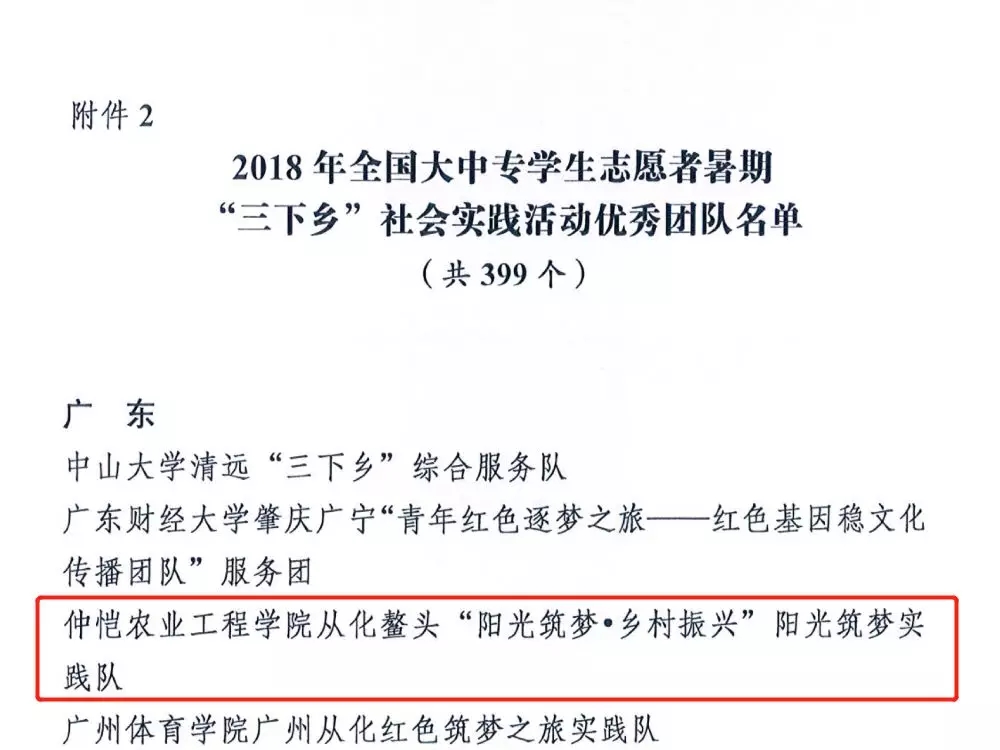 近日,团中央学校部发布《2018年全国大中专学生志愿者暑期“三下乡”社会实践活动总结通报结果公示》。经系团总支申报、学院团委审核、团省委推荐、专家评审等环节,最终评选出全国优秀实践团队399个,我校自动化学院“阳光筑梦 乡村振兴”阳光筑梦实践队荣获全国优秀团队。