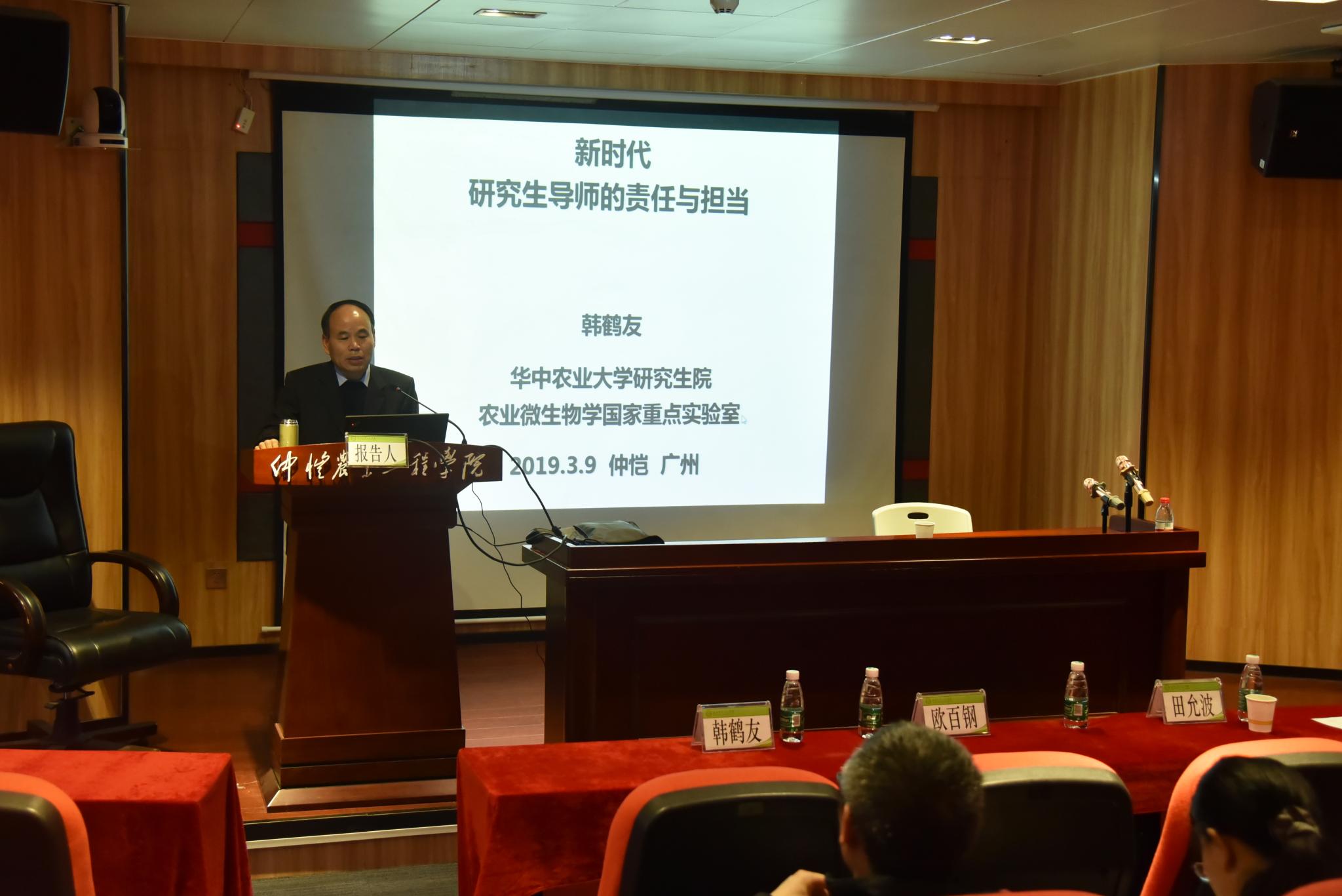 3月9日下午,学校在海珠校区英东楼111小报告厅举行学科建设与研究生教育专题报告会,国务院学位办欧百钢博士、华中农业大学研究生院常务副院长韩鹤友教授应邀为我校做专题辅导报告。学校发展规划处、研究生处负责人,13个重点学科带头人与骨干,以及2018年新增硕士生导师参加了此次报告会。会议由副校长田允波主持。