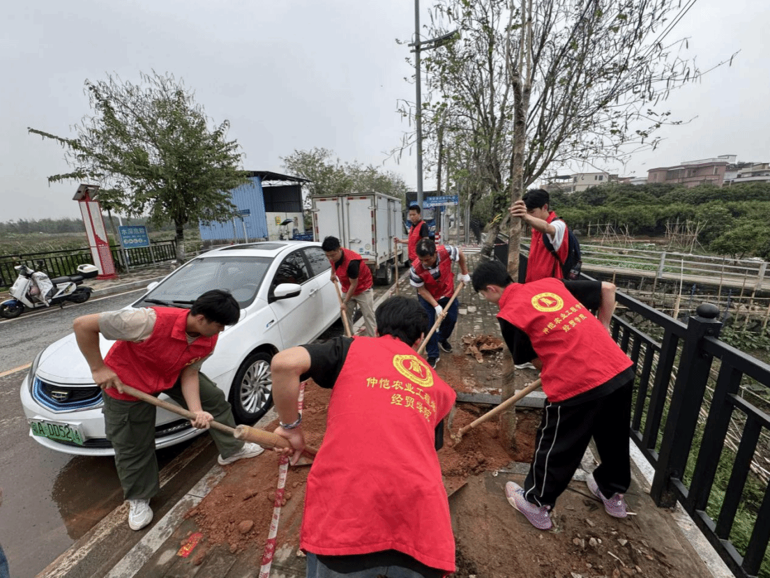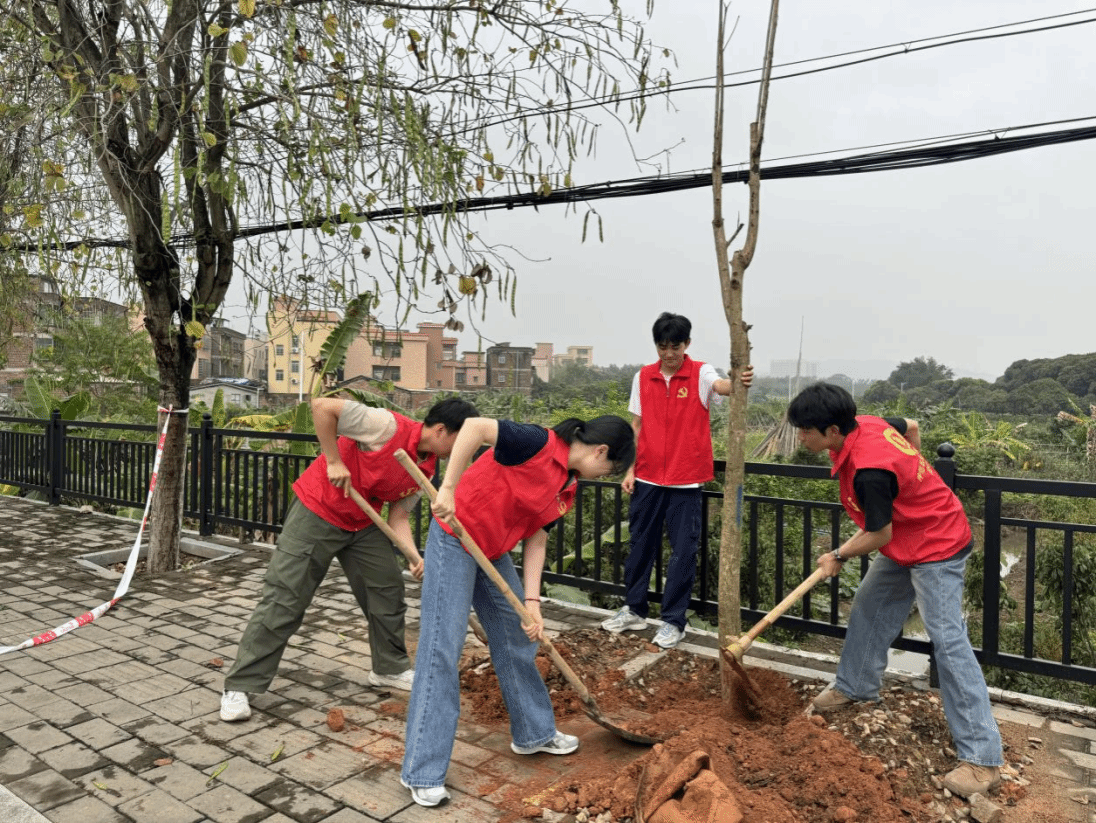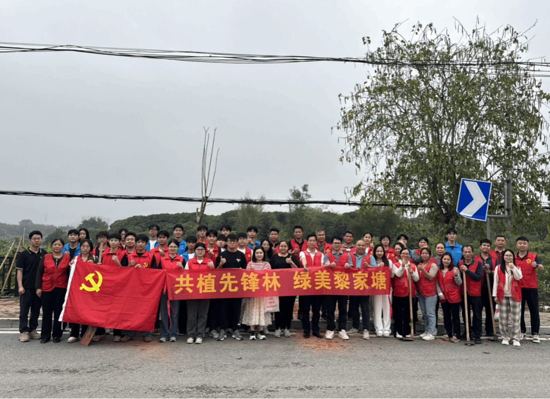 为深入贯彻落实党的二十届三中全会关于生态文明建设的重要部署,引导青年党员将“红色初心”植入“绿色发展”,以躬身实践诠释“绿水青山就是金山银山”的发展理念。4月27日下午,经贸学院会展专业学生党支部前往黎家塘村开展“植此青绿担使命”主题党日活动,以实际行动为美丽乡村增添新绿。黎家塘村党委联合经贸学院会展专业学生党支部、广东机电职业技术学院人工智能学院党总支学生党支部开展植树主题党日活动。