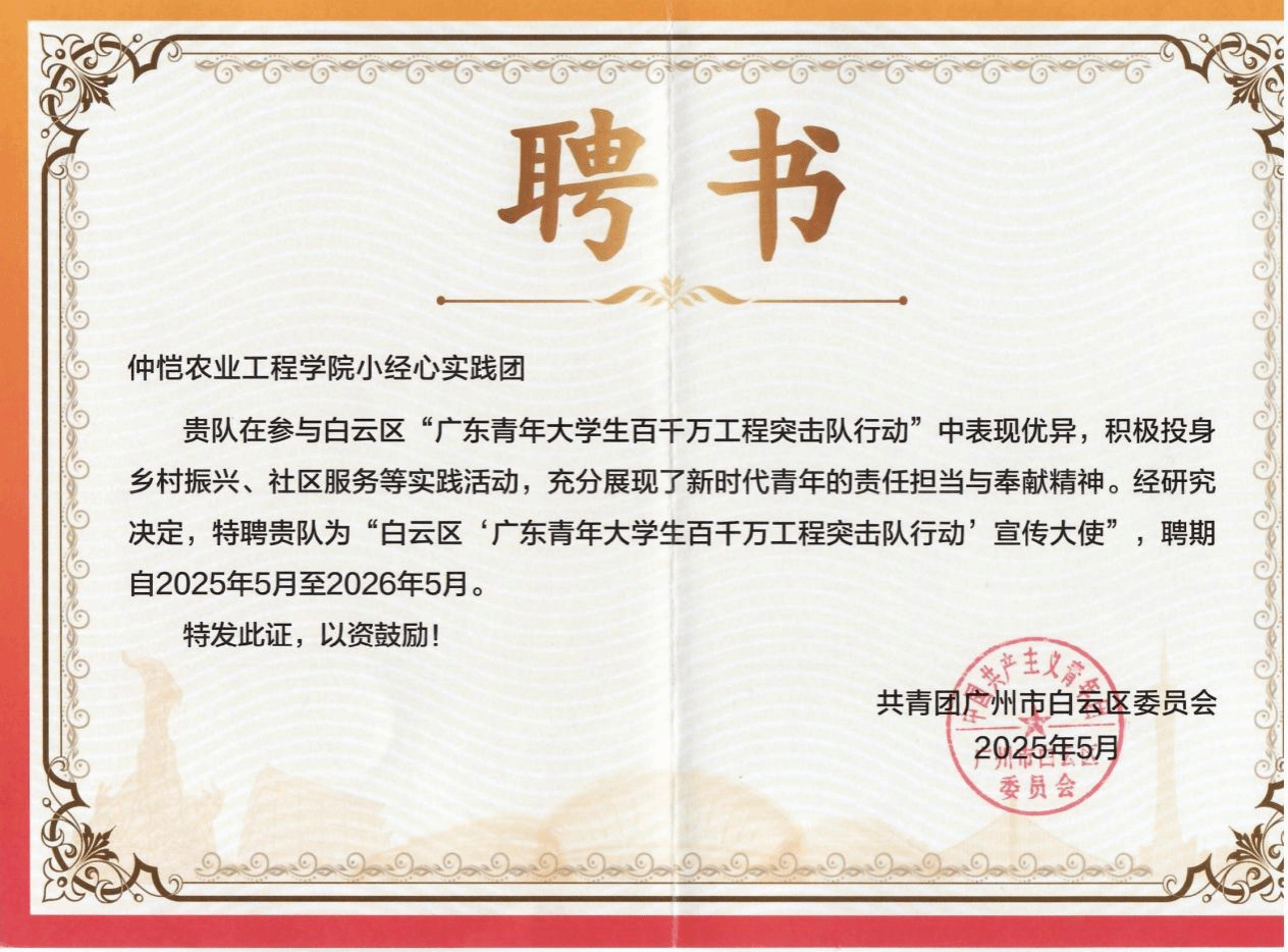 活动中,白云区委副书记邱之仲为小经心实践团颁发白云区“广东青年大学生百千万工程突击队行动”宣传大使聘书。从2023年开始,小经心实践团连续两年在白云区钟落潭镇黎家塘村开展“百千万工程”突击队行动,紧密围绕农创塑造农企品牌、文化赋能乡村振兴两大主线,为黎家塘村宣传古村落、设计黎家塘村村徽,为黎家塘村迎峰连心家庭农场打造农产品科普长廊,设计传统农具展、创意草帽、路口指引牌、特色文化衫,拍摄花卉时尚大秀、覃师傅寻花计、创意农具展、打造特色草帽IP等系列创意广告视频。据悉,小经心实践团曾荣获2023年广东大中专学生志愿者暑期文化科技卫生“三下乡”社会实践活动暨广东青年大学生“百千万工程”突击队行动省级重点团队和省级优秀团队、“大学生在行动”国家级优秀小分队和省级优秀小分队;2024年度“大学生在行动”省级优秀小分队。团队指导老师黎静、徐杨龙获省级优秀指导老师,陈德仪同学和胡秋玲同学获“大学生在行动”省级优秀志愿者。