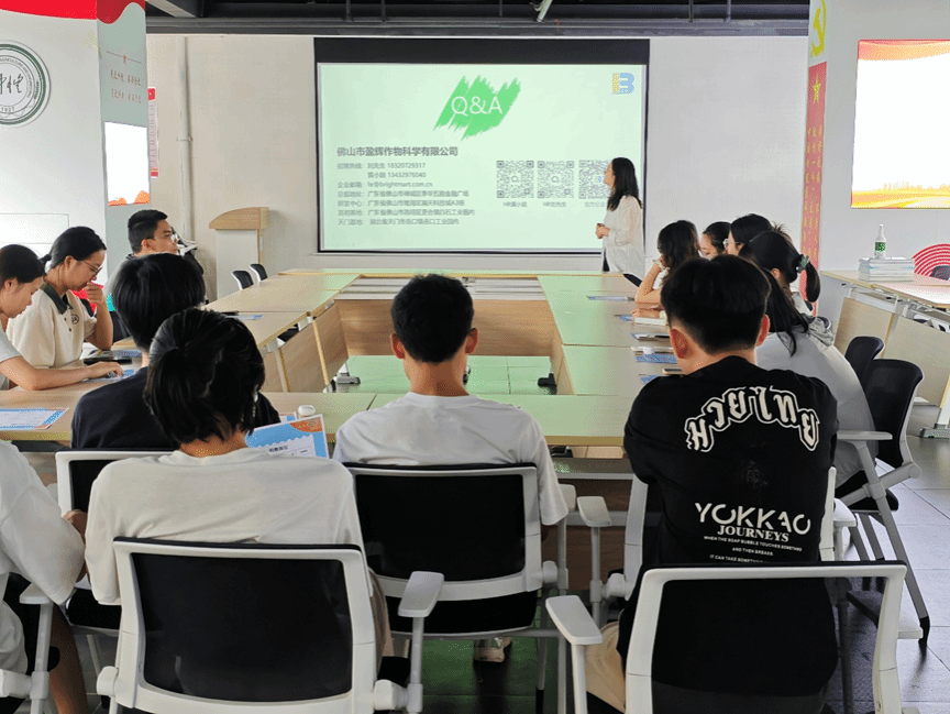 盈辉作物人事经理刘映通过企业宣传片系统展示了公司核心技术领域与社会责任实践,并围绕产学研合作、专利成果及人才需求展开详细解读。她强调:“我们期待具备创新思维和实践能力的毕业生加入,共同推动绿色农业发展。”