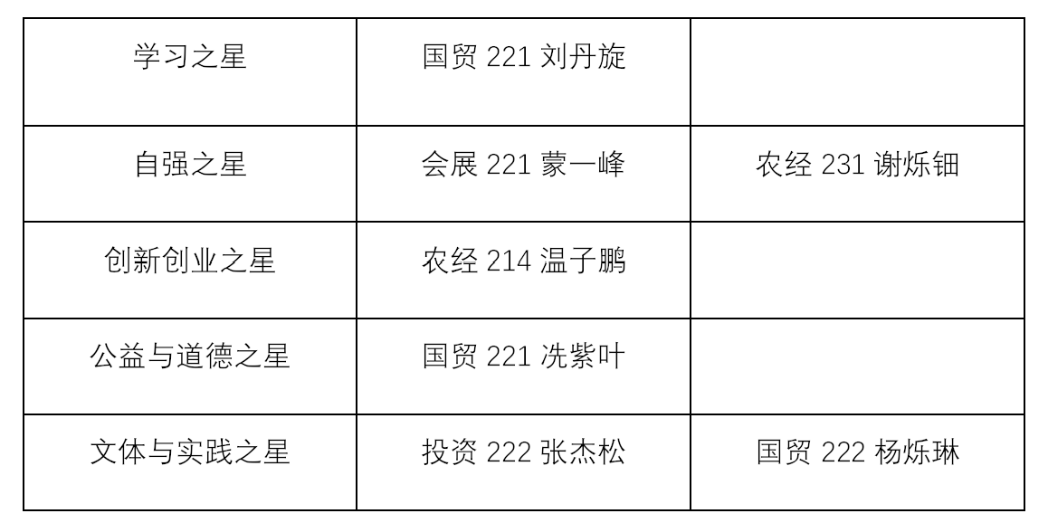 根据《关于开展2025年“百名优秀学子”评选活动的通知》(仲字号{2025}15号),经个人申报、学院初审、讨论,“百名优秀学子”答辩会流程,拟推荐刘丹旋等7名同学为经贸学院“百名优秀学子”,名单如下: