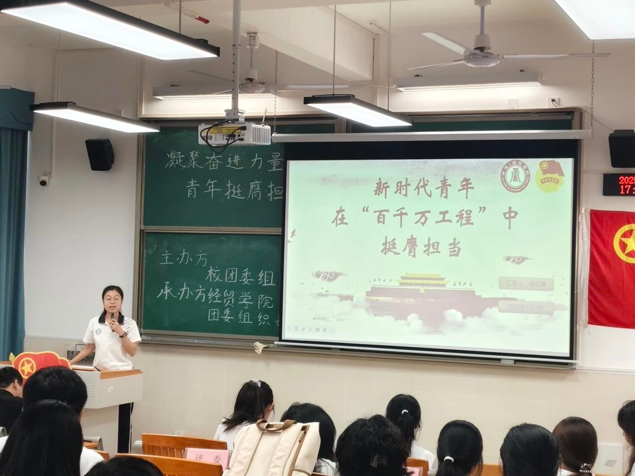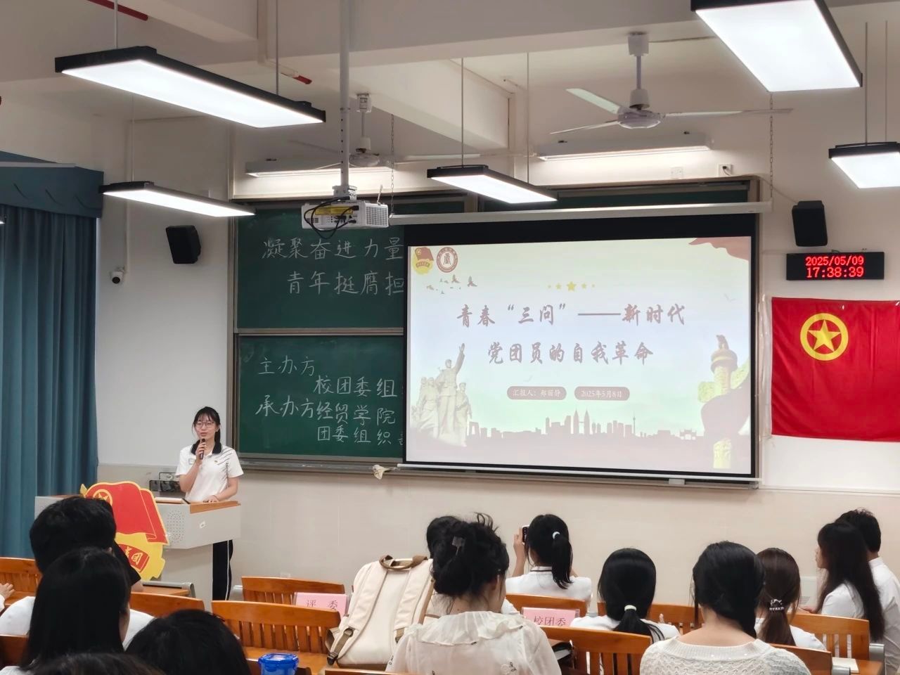 为深入学习贯彻党的二十届三中全会精神,进一步强化经贸学子的思想政治引领,激励学子们勇担时代使命,锻造兼具家国情怀与世界眼光的青年政治骨干,经贸学院团委于5月9日下午在经管大楼312室开展以 “凝聚奋进力量,青年挺膺担当”为主题的党团课讲座,主讲人为经贸学院团委副书记徐杨龙,经贸学院团委书记团、校团委代表以及2025年经贸学院全体入团发展对象参加本次党团课。