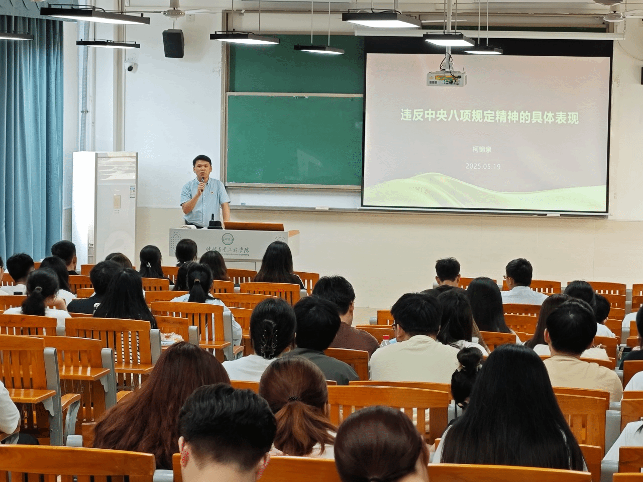 为进一步强化毕业生党性教育,增强毕业生党性意识,让毕业生在今后的学习与工作中自觉践行初心与使命,5月19日下午,管理学院党委书记柯锦泉在经管楼210为2025届毕业生党员讲授“深入贯彻中央八项规定”的主题党课。管理学院党建事务中心指导老师以及各支部毕业生党员参与本次学习。