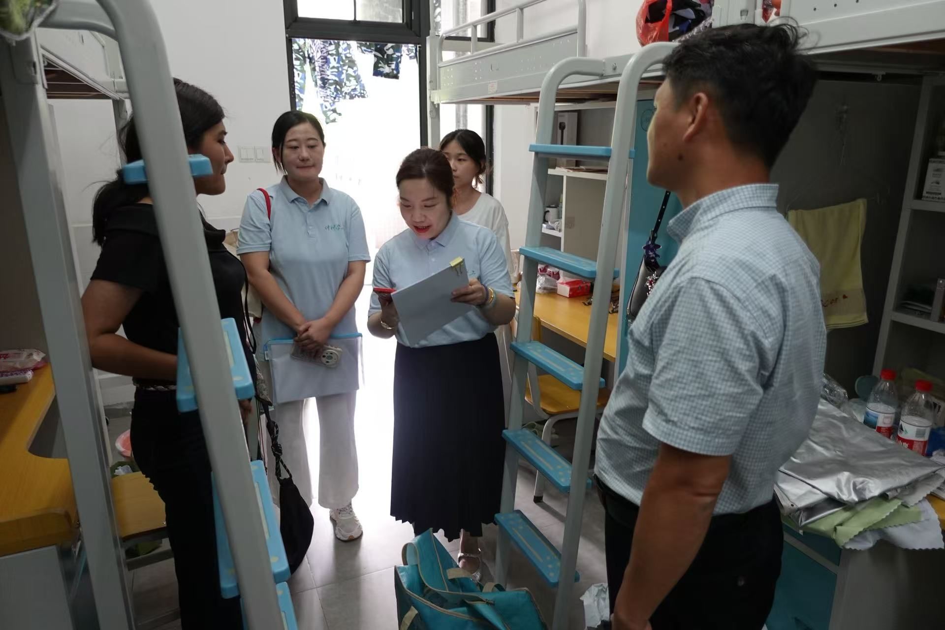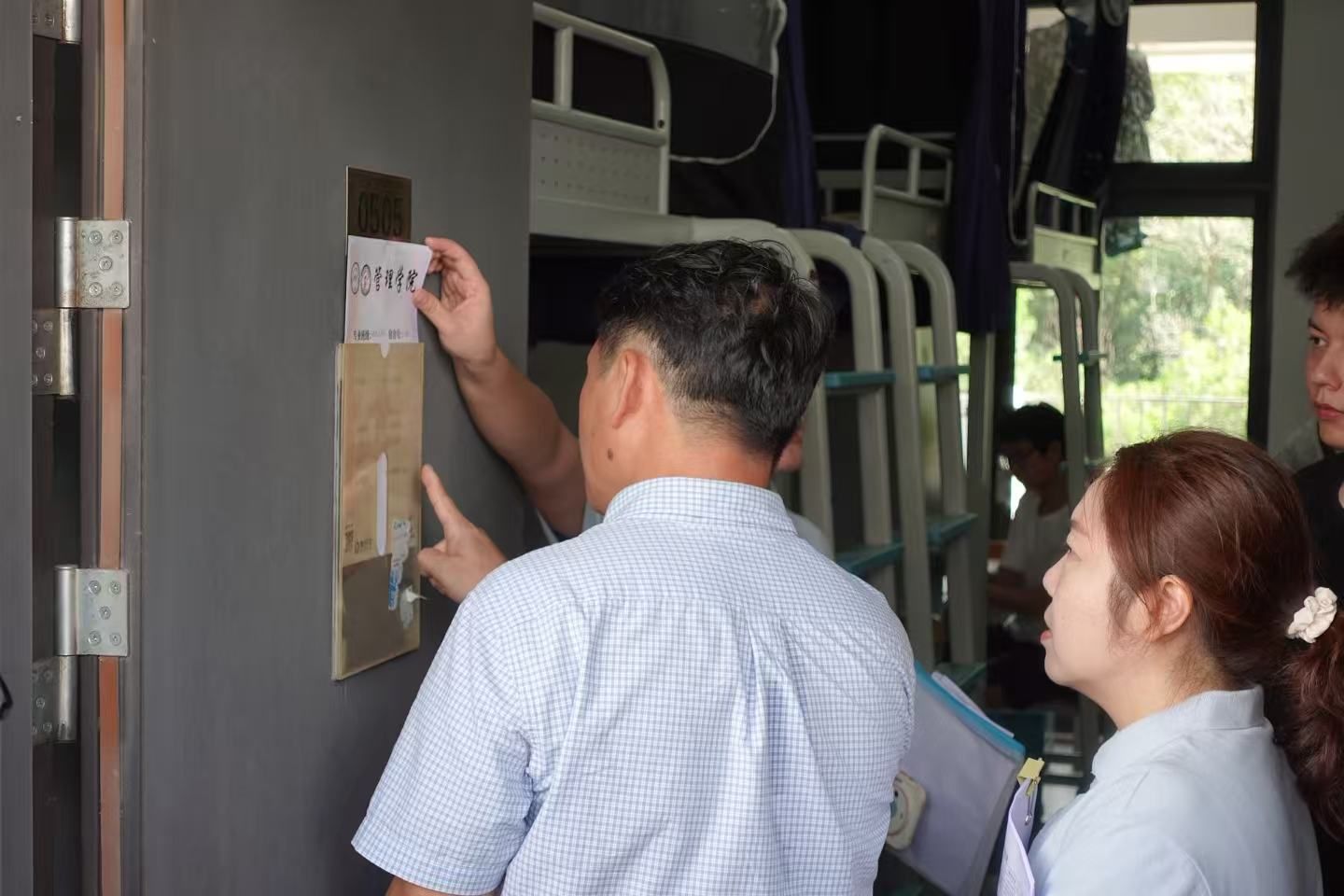 此外,学院领导和老师们还细致检查了宿舍的基础设施,从床铺安全、水电设施到卫生状况,都逐一检查确认,确保同学们居住环境的安全与舒适。领导们还特别强调宿舍安全问题,嘱咐同学们“不使用大功率电器、离开宿舍要断电、保护好个人财产”——这些亲切又温暖的嘱托背后是学院对同学们的深切关怀。