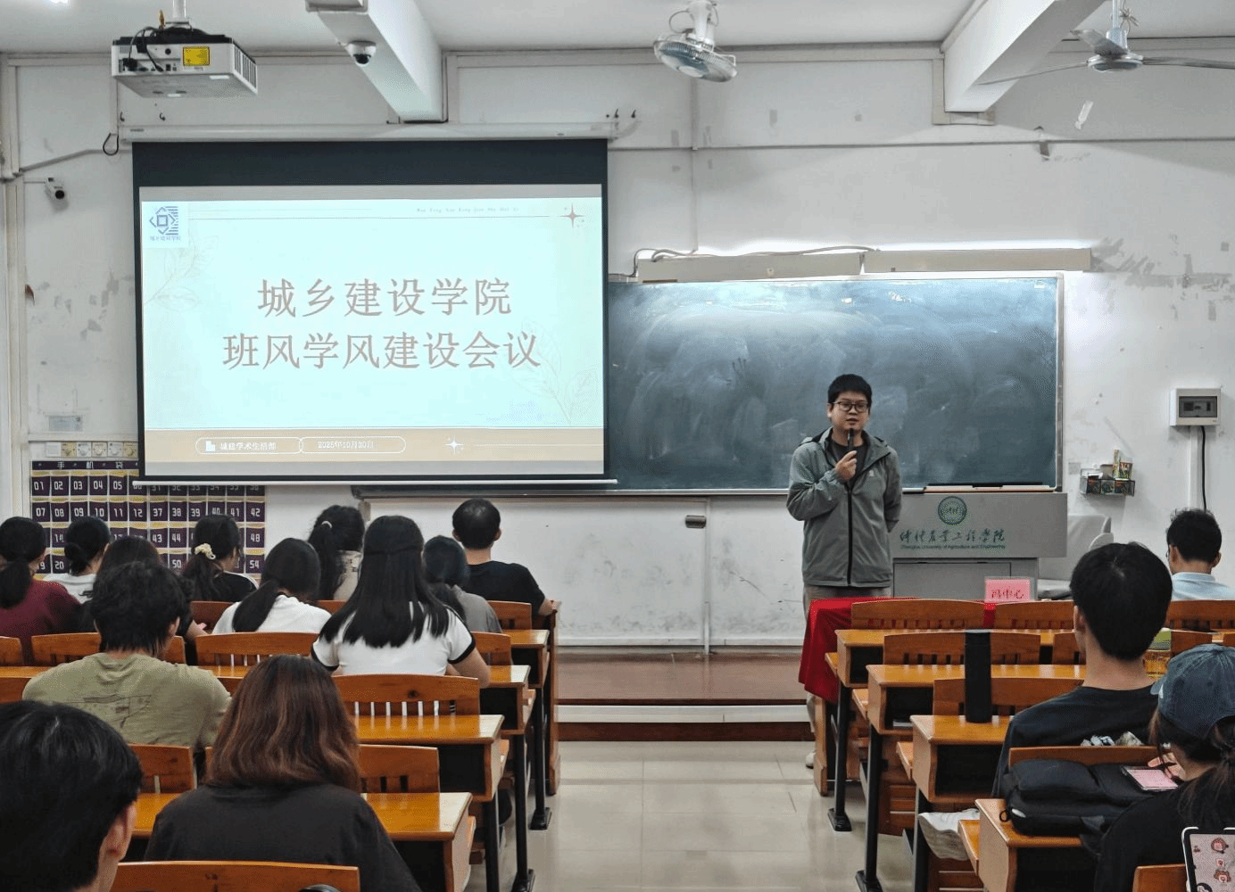为推进班风学风建设,提升人才培养整体质量,城乡建设学院于10月30日下午5点在杨楼202召开“2025-2026学年班风学风建设大会”。 城乡建设学院辅导员冯中心、刘楚涛、耿梦欣、李超,城乡建设学院学生团委副书记,学生会主席团成员,学术生活部负责人,23、24、25级班长、学委以及团支书等参会。