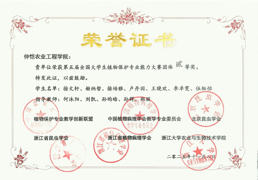 农业与生物学院学子凭借扎实的专业功底、出色的实践能力和默契的团队协作,在激烈角逐中脱颖而出,徐文轩荣获“项目一:昆虫标本现场制作”环节的三等奖(指导老师:何沐阳、刘凯、孙昀皓)。徐培雅获得“项目二:昆虫解剖和昆虫结构绘图”环节的二等奖(指导老师:刘凯、何沐阳、孙昀皓)。卢丹羽、徐文轩获得“项目三:昆虫微景观展示”环节的三等奖(指导老师:何沐阳、刘凯、孙昀皓)。王晓欢获得“项目四:植物病理学实验操作和病原菌结构绘图”环节的三等奖(指导老师:孙辉、孙昀皓、何沐阳、刘凯)。李卓雯获得“项目五:植物病虫害知识考核”环节的一等奖(指导老师:刘凯、孙辉、何沐阳、孙昀皓)徐文轩获得“项目六:创新创业优秀项目展示”环节的特等奖(指导老师:何沐阳、刘凯、孙昀皓)。伍钰怡获得“项目七:本科生学术交流报告”环节的三等奖(指导老师:郑丽、何沐阳、刘凯、孙昀皓)。姬纳哲获得“项目八:植物保护专业知识视频制作与展示”环节的二等奖(指导老师:何沐阳、刘凯、孙昀皓)。姬纳哲获得“项目九:植物保护专业知识动画制作与展示”环节的三等奖(指导老师:刘凯、何沐阳、孙昀皓)