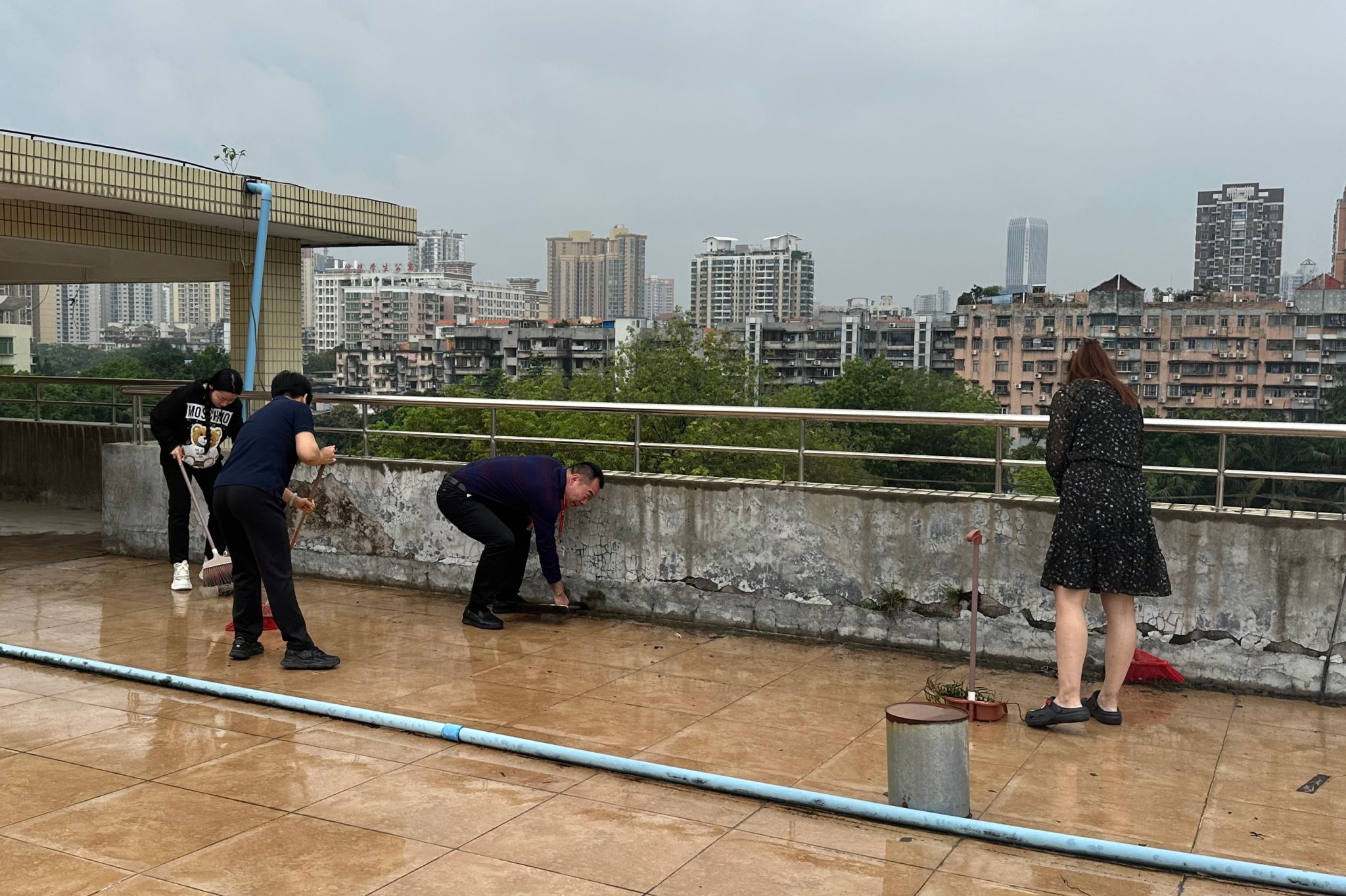 3月30日,雨势未停。党员们主动请缨,重返楼顶,全面排查并疏通所有排水管道,清理淤泥落叶,加固隐患接口。以“时时放心不下”的责任感,筑牢校园防汛安全线,让正确政绩观在久久为功中扎根。