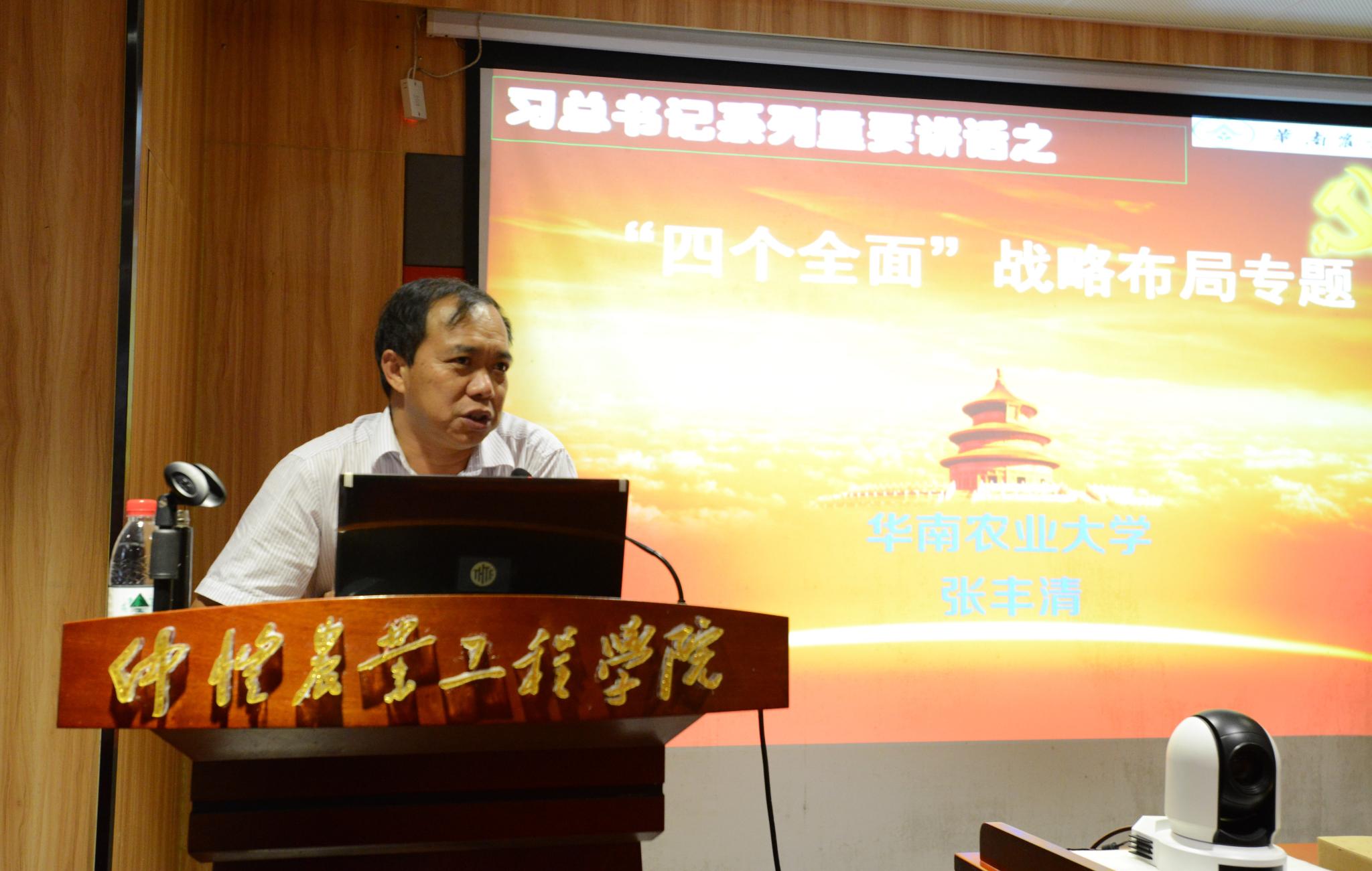 张丰清教授在开讲一开始就批评目前有部分党员及党员不关注中央讲话,反而是国外媒体和群众十分重视这一现象,提醒广大的党员和党员干部需要时刻关注中央的系列讲话,明白中央的施政方针。而后,张教授从“四个全面”的概述、特点以及“四个全面”的具体内容展开讲授。张教授认为“四个全面”是马克思主义中国化创新的成果同时具有直面我国当代社会发展所面临的矛盾问题、直面我国国家发展战略的现实需要、直面中华民族伟大复兴中现阶段的战略部署的现实意义。继而,张教授深度解读全面建成小康社会、全面深化改革、全面依法治国以及全面从严治党主张。张教授调侃道现在的社会最缺的是理想、最乱的是价值观、最多的是钱,面对这种社会现象我们必须要树立广大党员的全面建成小康社会的理想,培养马克思主义信仰观。在全面深化改革中,必须要坚持正确的方向,在大是大非面前必须要立场坚定旗帜鲜明。张教授特别指出全面深化高校思政工作任重道远。在全面依法治国这一方面,要坚持从中国实际出发,坚持法治和德治相结合,增强全民法治观念,推进法治与社会建设。最后,张教授强调全面从严治党是中央的一贯方针,十八大以来全面从严治党取得了一系列成效落实了从严治党的责任、严肃党内政治政治生活、加强巡视制度,加强了党内监督,这使得党员和党员干部进入了一个“真”常态。