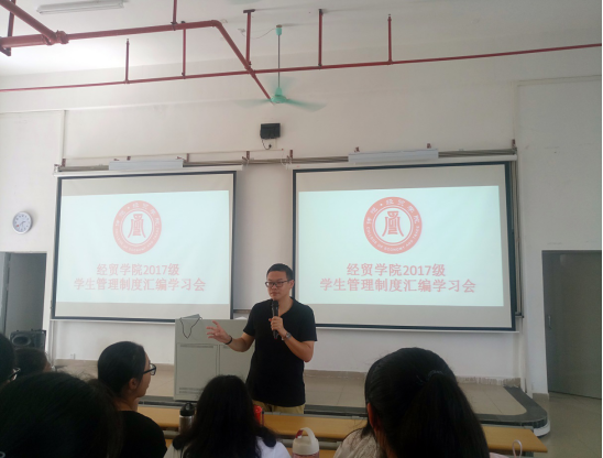 为更好地帮助2017级同学们了解与遵守学校相关规定,经贸学院于9月26日下午在D2礼堂组织404名新生分两轮学习了《学生管理制度汇编》并观看电影《廖仲恺》。会议由辅导员余封亮老师主持。
