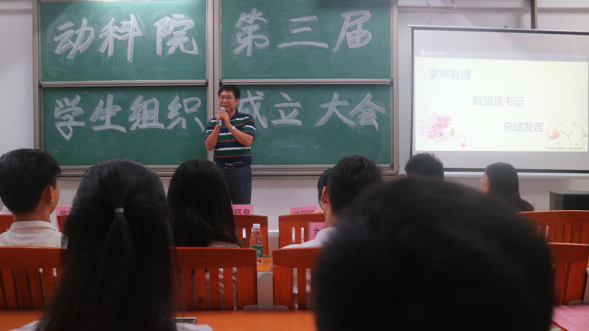10月19日下午,动物科技学院第三届学生组织成立大会在综合楼511室顺利举行。动科院党总支书记欧坚泉、团委书记沈洁及院团委、学生会、新闻中心﹒易班分站、助班团的全体新老干部出席本次会议。