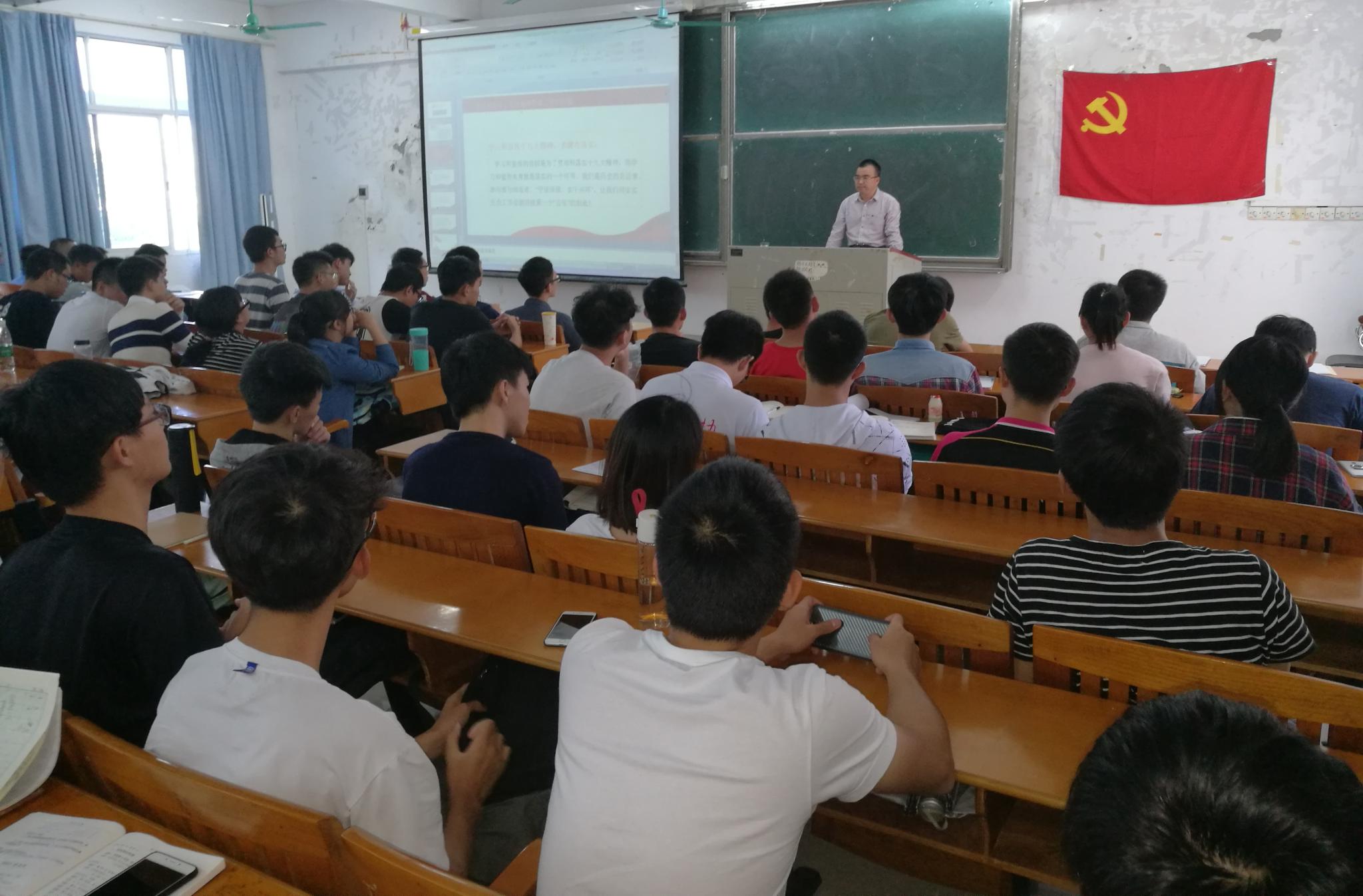 10月22日下午,机电工程学院学生党支部在白云校区杨钊杨勋楼210室举行了十九大报告专题党课学习会。该院辅导员、全体学生党员和入党积极分子共200多人参加了党课学习。党课由学院党总支副书记何宝国主讲。