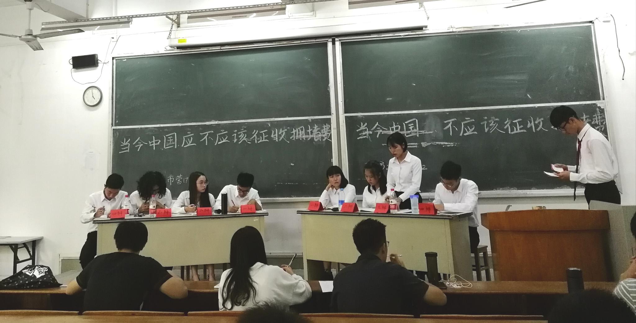 2017年10月28日,管理学院学生会于教学楼B401室组织开展学院“新生杯”辩论赛第二轮小组积分赛。本场比赛的主题是“当今中国应不应该征收拥堵费”。学院辩论队易瀚涛、彭兆康、蔡佳茵担任本次比赛的评委。