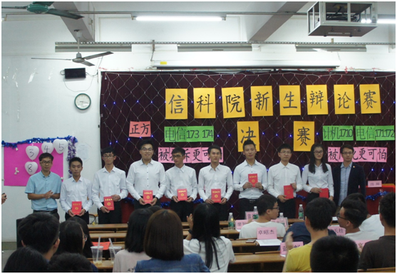 为丰富大学生的课余活动,培养同学们的思辩能力和语言表达能力,推进学风建设工作,11月4日,信息科学与技术学院在教学楼b401室举办新生辩论赛决赛。学院党总支副书记王浩、辅导员吴南生出席,200余名学生观看了决赛,评委由学院历届辩论队队长担任,电信173/174班联队获得了决赛冠军,计算机1710/电信171/172班联队获得了亚军。