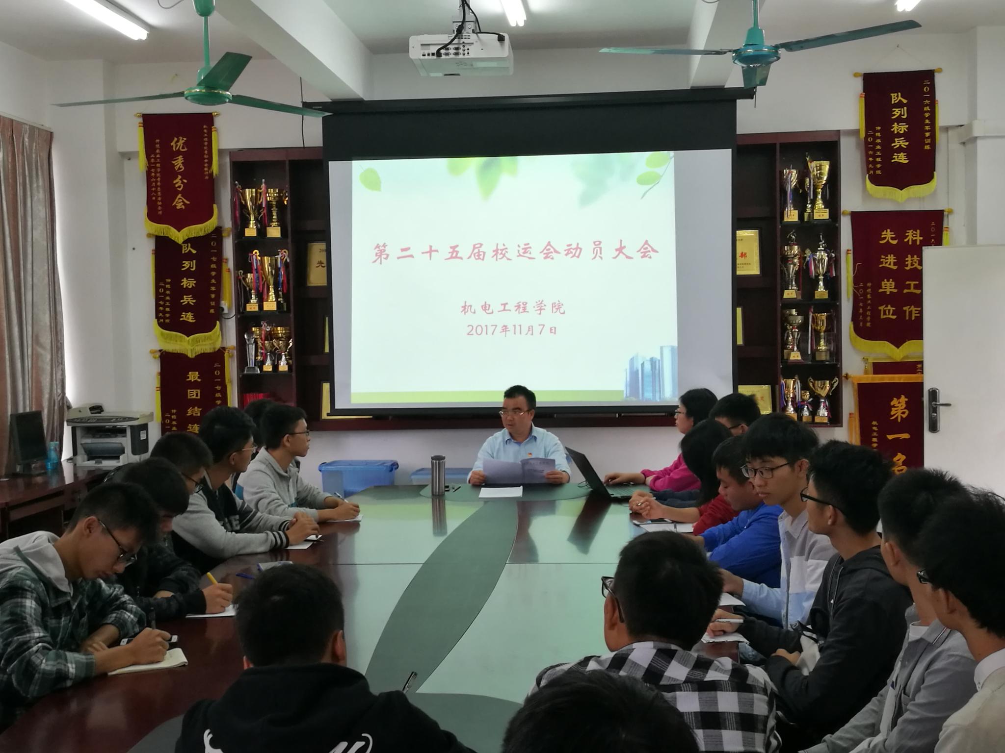 11月7日中午,机电工程学院在白云校区刘宇新楼202会议室召开了第二十五届校运会动员大会。学院党总支部副书记何宝国、辅导员尹彩霞、院学生会主席团代表、团委书记团代表、运动员及各班班长、团支书出席了本次会议。