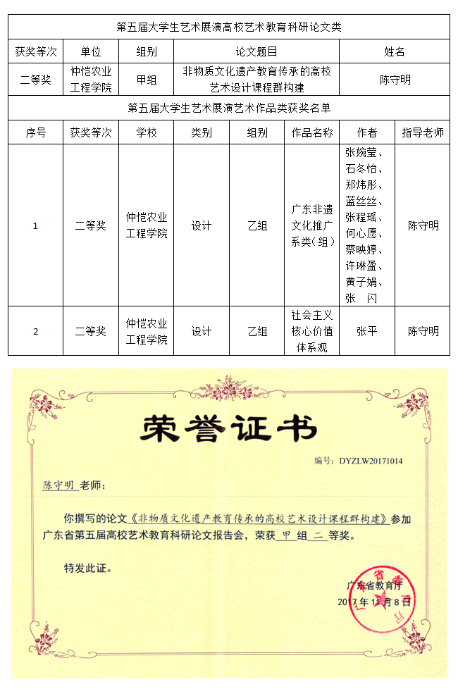 近日,广东省教育厅发布了《广东省教育厅办公室关于召开第五届全省高校艺术教育科研论文报告会的通知》(粤教体办函【2017】181号)、《广东省教育厅关于举行全省第五届大学生艺术展演及高新美育研讨活动的通知》(粤教体函〔2017〕102号)。从通知获悉,我校何香凝艺术设计学院陈守明老师的教学科研论文荣获二等奖,其指导视觉传达设计专业张婉莹、张平等学生的设计作品获得专业组二等奖的好成绩。全省第五届大学生艺术展演是教育部全国大学生艺术展演活动的预演,每三年举办一次,活动涵盖音乐、戏剧表演、美术、设计等多个学科。活动旨在给学生提供丰富多彩的艺术实践活动,让每个学生在感受美、表现美、鉴赏美、创造美的过程中提高审美和人文素养。