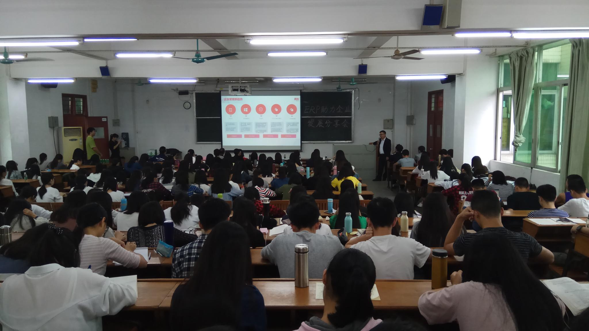 为了让管理学院学生了解ERP系统、对自身有更明确的定位、了解更多样化的就业选择,管理学院于11月17日下午在教学楼B401室举办了ERP助力企业发展的分享讲座。管理学院党总支副书记江丽、2014级辅导员张金凤,用友网络科技股份有限公司华南区广州事业部总监周超群,泽普企业管理咨询有限公司总经理谢凯航、培训总监温淑敏、校园招聘项目总监王国强出席本次讲座。参加这次讲座的还有对ERP系统感兴趣的学生。