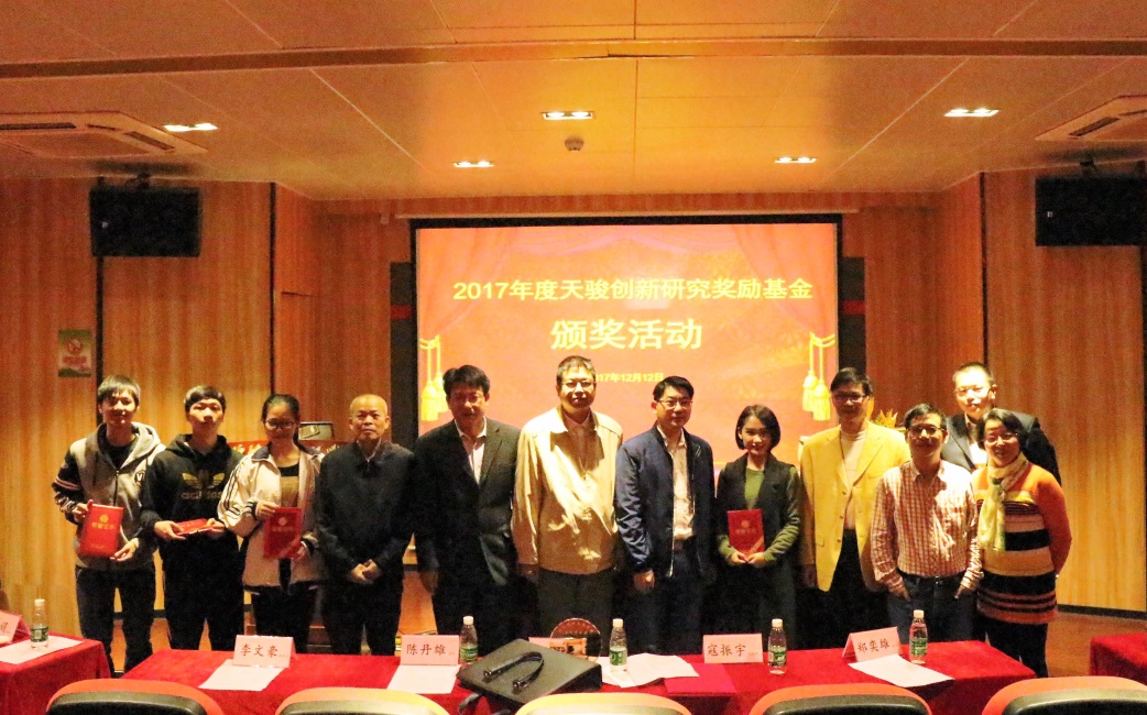 2017年12月12日上午,由广东新供销天骏供应链有限公司(以下简称“天骏公司”)在我校捐资设立的“天骏创新研究奖励基金”2017年度颁奖活动在英东楼111报告厅隆重举行。广东省仲恺教育基金会李文豪秘书长,天骏公司吴英伟董事长、寇振宇总经理、陈迪亮董事长助理、张玉娟经理,农业与生物学院陈丹雄书记、郑奕雄院长、周超雄副书记,出席了本次颁奖活动。