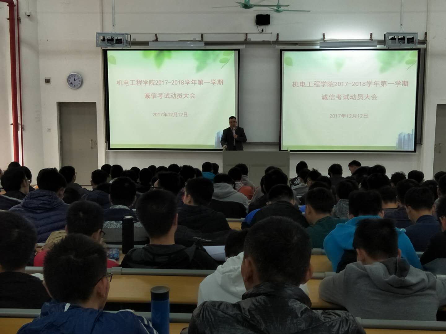 为营造学院优良学风考风氛围,机电工程学院在白云校区D栋2楼举办2017年第一学期期末诚信考试承诺动员大会,该学院党总支副书记何宝国出席会议,机电工程学院2017级全体学生参加了本次会议。