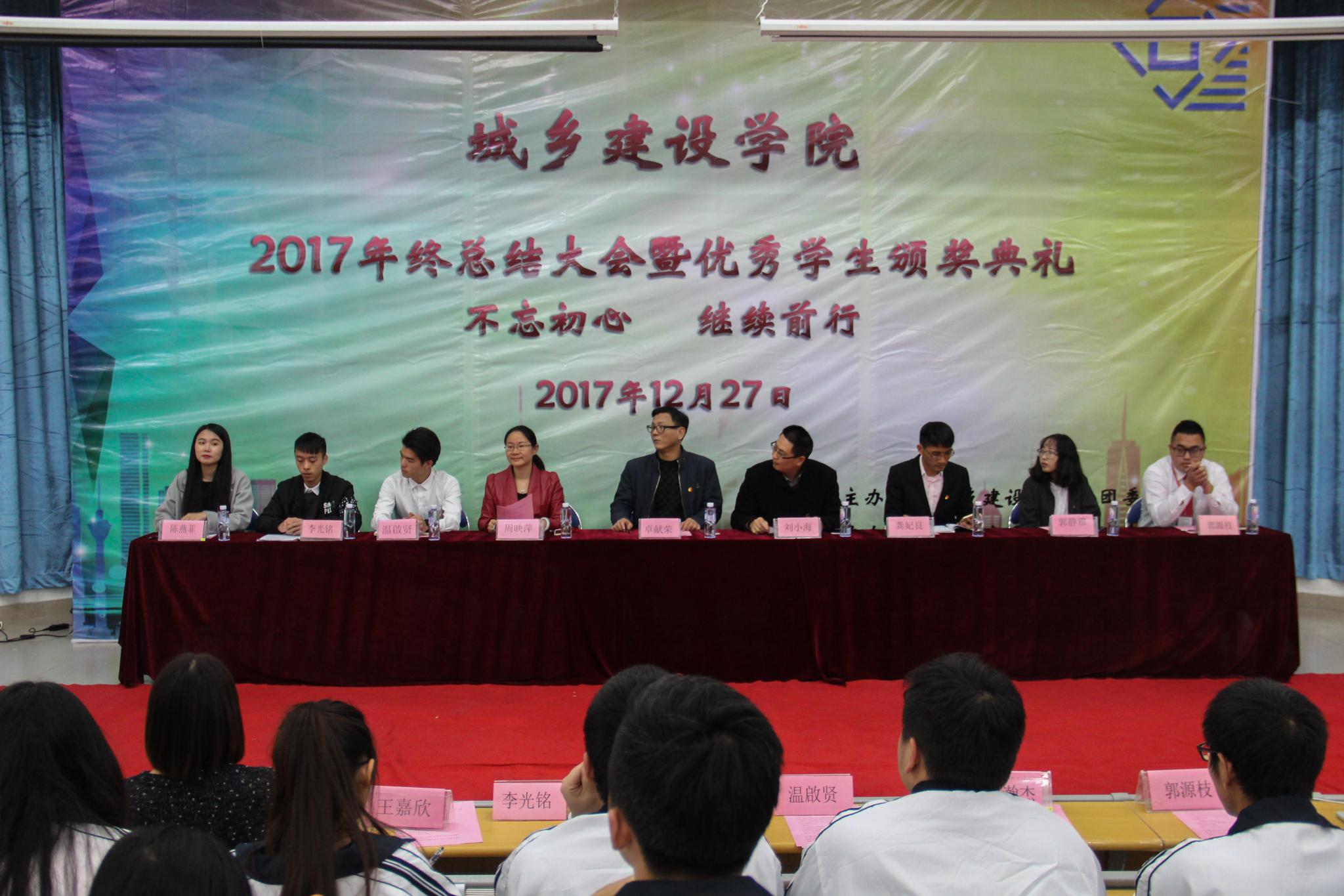 12月27日下午,城乡建设学院2017年学生工作总结暨优秀党员、学生干部表彰大会在白云校区D1阶梯教室举行。该院院长卓献荣教授、刘小海老师、辅导员周映萍、龚妃良等出席了本次大会,并分别作了讲话。该院学生党支部党员、入党积极分子、团学组织主要干部以及各班学生代表,近300名同学参会。