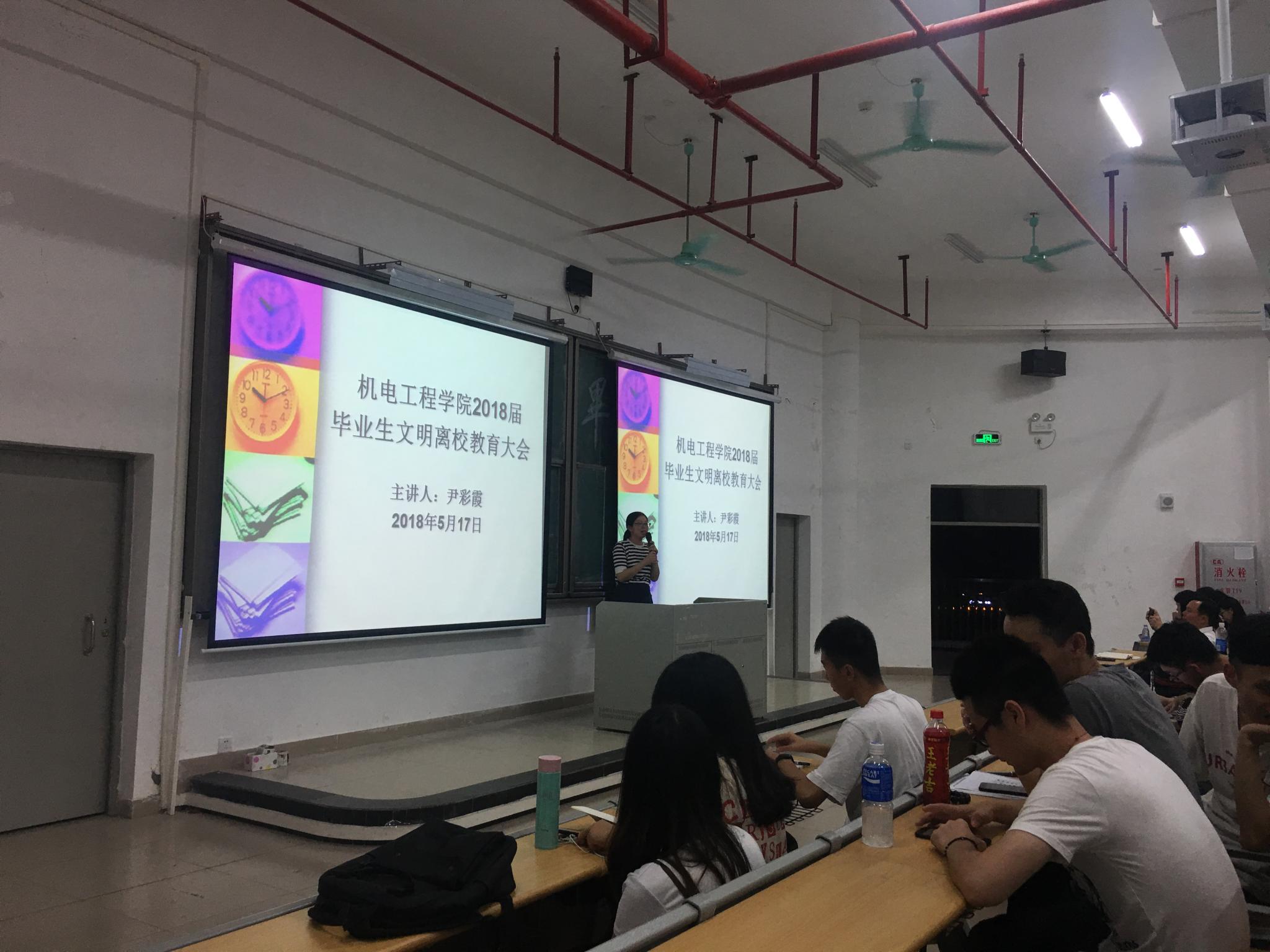 为引导2018届毕业生文明安全有序离校,认真做好毕业生文明离校服务工作,5月17日,机电工程学院在白云校区D栋综合教学楼D2室举办了2018届毕业生文明离校教育大会。该院党总支书记张平湖出席,辅导员尹彩霞及2018届295名毕业生参加了大会。