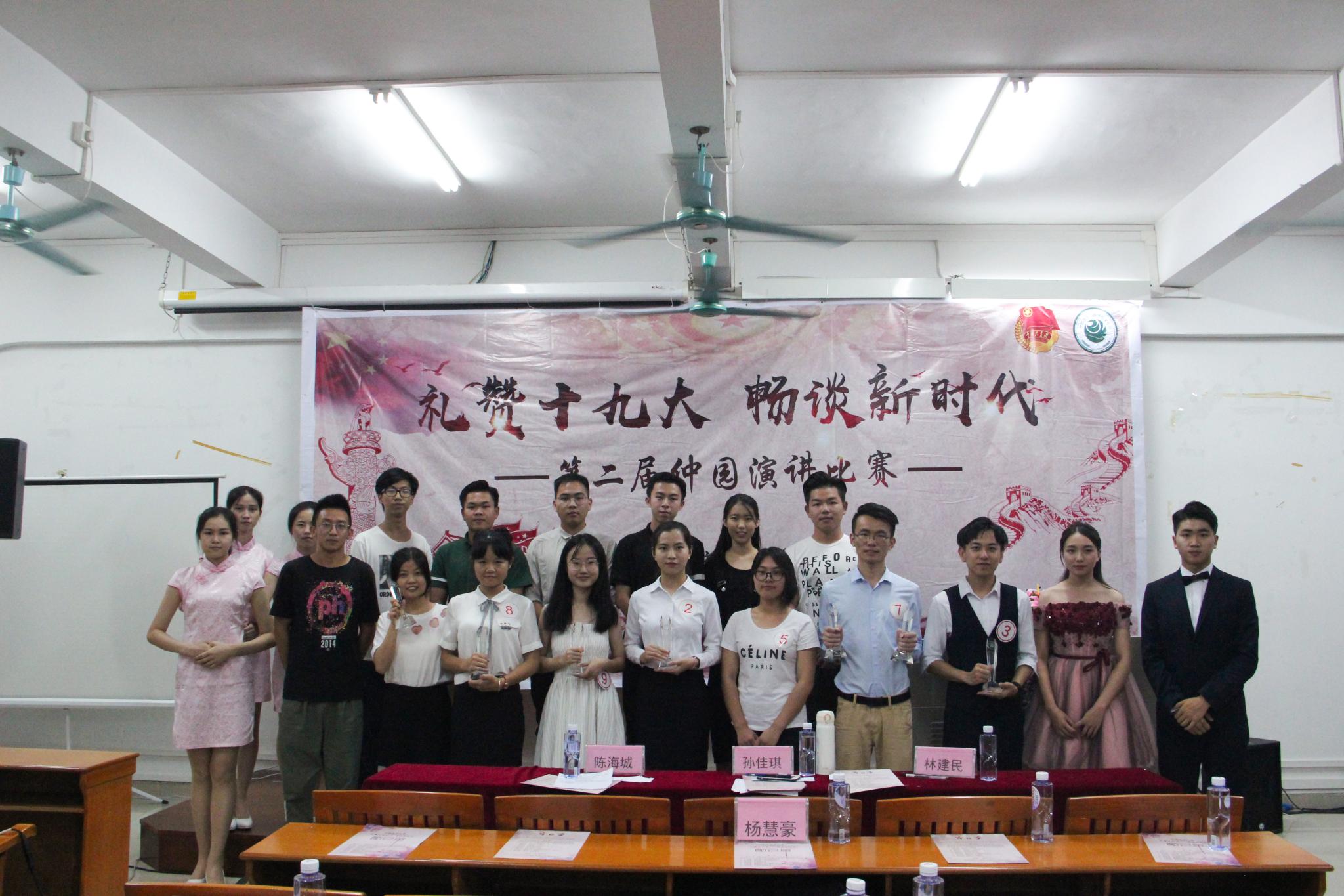 为了紧跟十九大,学习新时代精神,聆听仲园富有创造力的故事。由校团委主办,校学生会承办,各学院学生会协办的2018年度“礼赞十九大,畅谈新时代”的仲园演讲比赛决赛在我校c206课室圆满落幕。白云校区学生会副主席杨慧豪,广播台司仪队队长孙佳琪,职协讲师团讲师陈海城、林建民出席了本次活动。演讲比赛也传达了大家对人生,初心,使命,十九大以及中国梦的看法。
