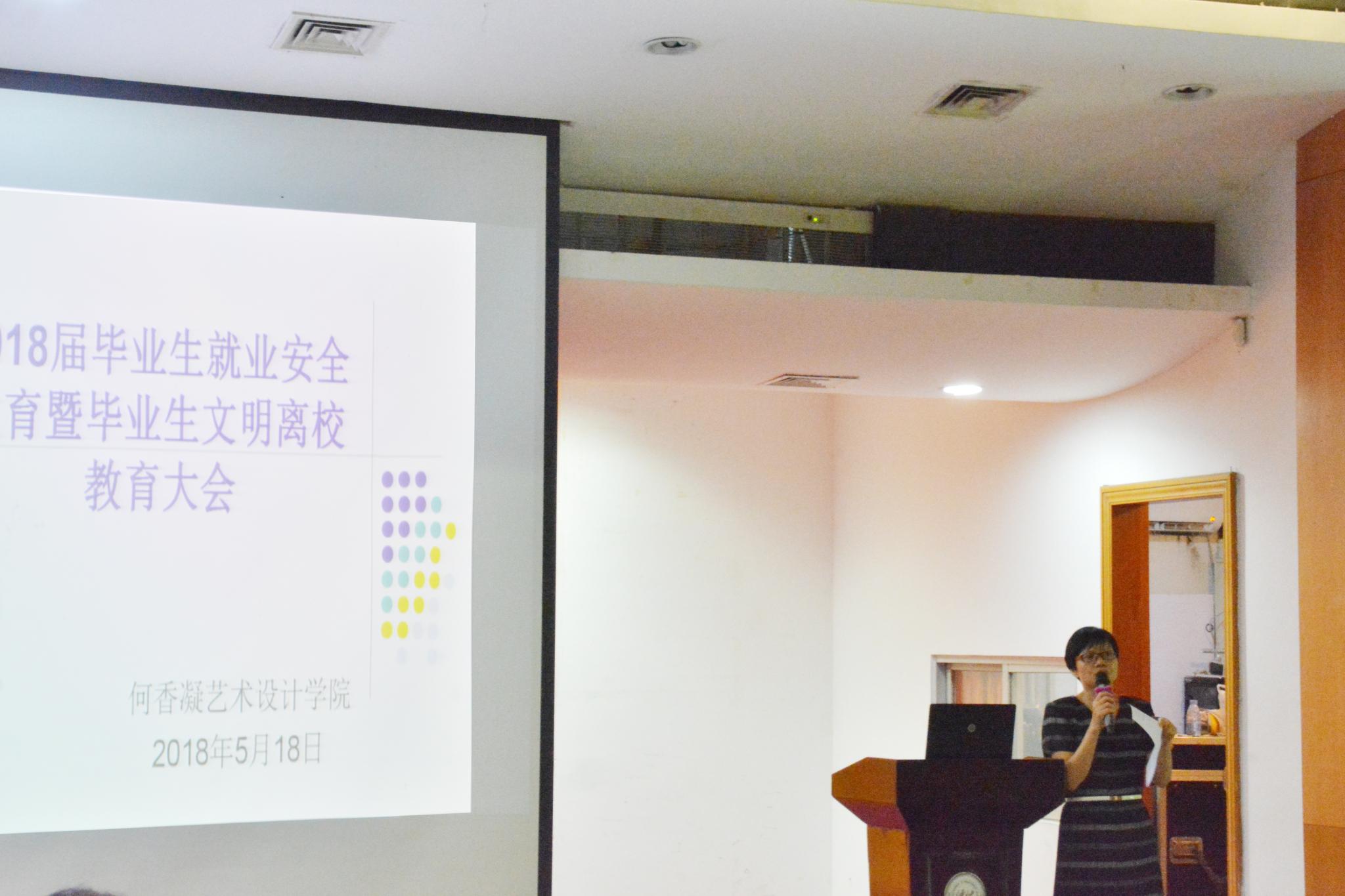 为确保2018届毕业生安全文明离校,营造文明有序的离校氛围,何香凝艺术设计学院于5月18日在海珠校区学术报告厅召开了2018届毕业生就业安全教育暨毕业生文明离校教育大会,学院党总支副书记姚荣玉、辅导员池月、教务员欧阳竹筠出席会议,2018届全体毕业生参加会议。