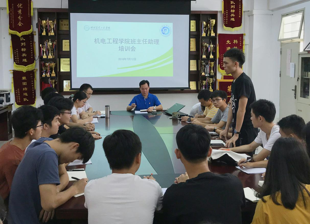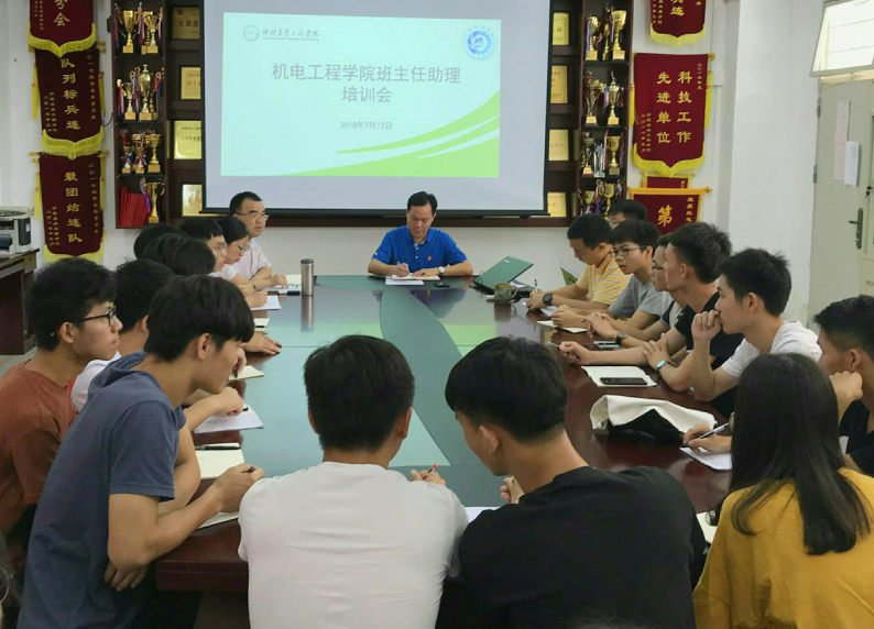 7月12日上午,机电工程学院在白云校区刘宇新楼202会议室召开了2018级学生班主任助理培训会议。该院党总支书记张平湖、副书记何宝国,辅导员尹彩霞、兰应飞、郑攀老师及优秀助班代表翁曼娜、2018级学生班主任助理参加会议。会议由何宝国副书记主持。