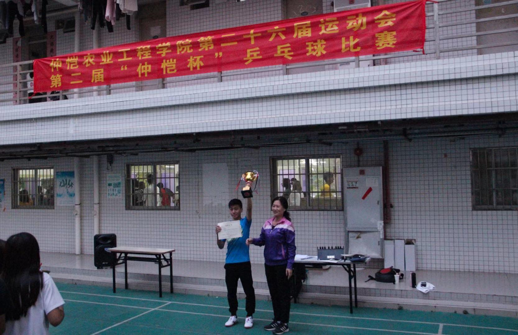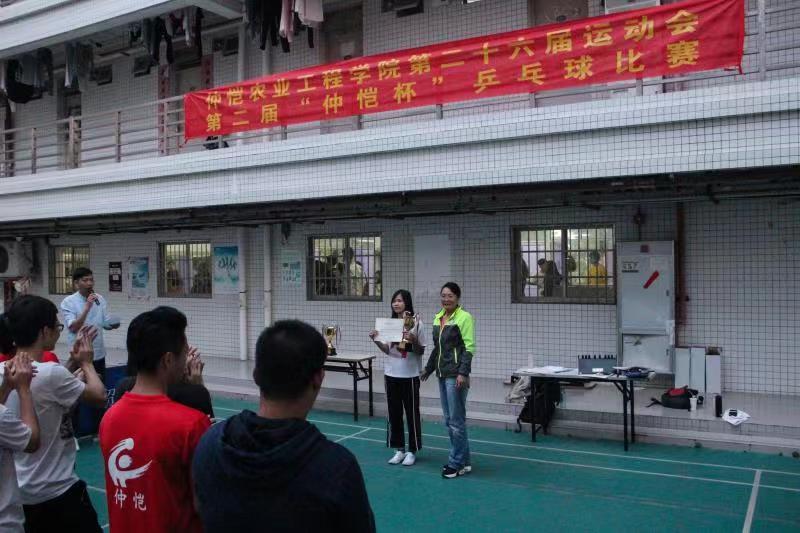 体育部黄继珍主任和刘英梅副主任亲临比赛现场分别为比赛获得第一名的农业与生物学院和第二名的动物科技学院颁发奖杯。本届“仲恺杯”乒乓球赛,比赛场面热情激烈,赛出了优异成绩,展现了最佳水平,比赛中各队员不畏艰难,努力拼搏,表现出色,尽情展现了乒乓球队员们积极拼搏、永不言弃的精神,有效的丰富了校园业余体育活动。