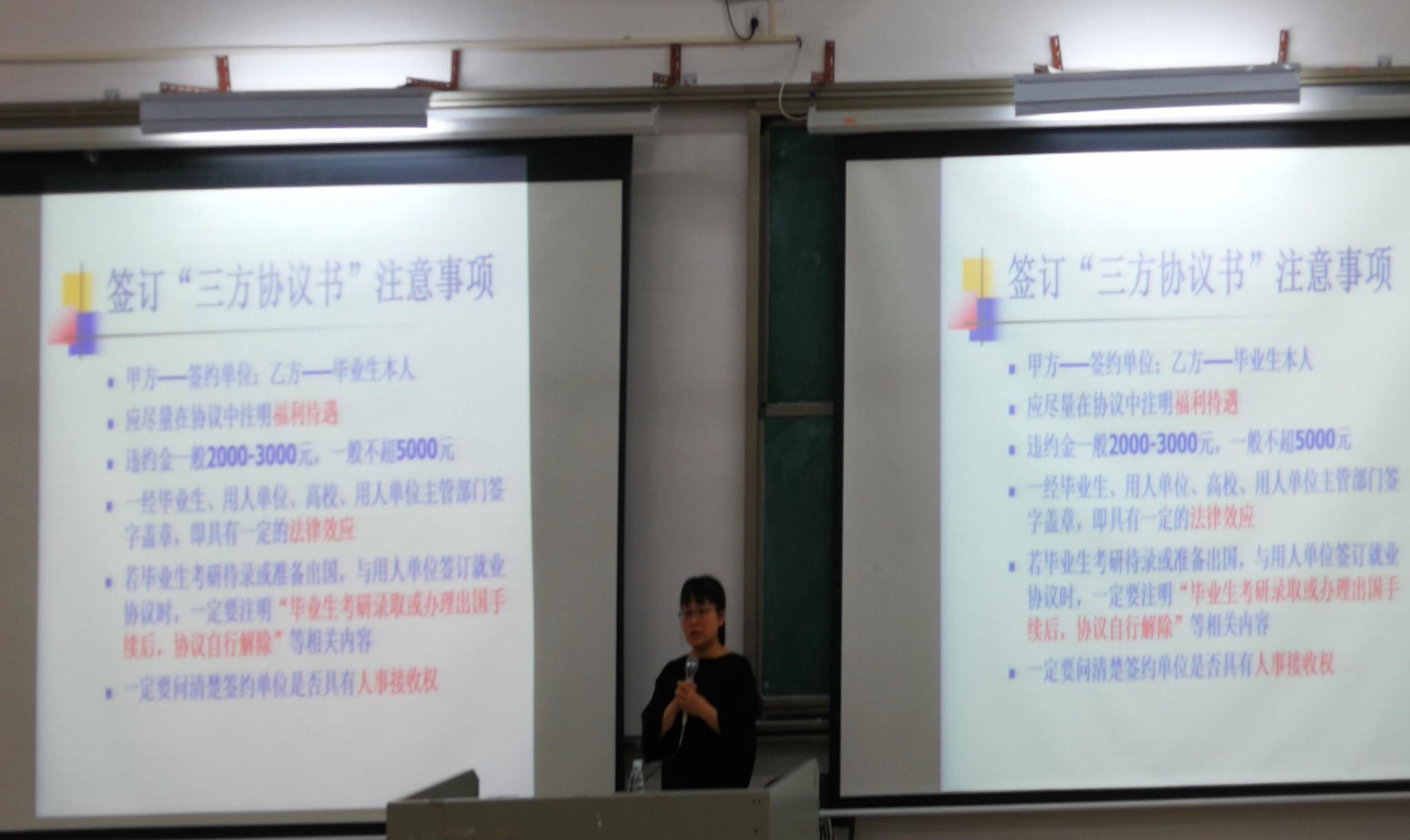 在本次会议中,周静首先提醒毕业生们注意自己的课程学分与创新学分是否修够,同时希望毕业生在实习时候注意安全问题,及时和学院、家长沟通自己的实习情况;其次老师介绍了外国语学院就业服务中心为毕业生们提供的暖心服务和独具特色的“爱心递”活动。随后,周静为毕业生讲解了三方协议、劳动合同、报到证、接收函、档案、户口等相关问题并重点强调了相关注意事项,同时在毕业生如何协调学习、实习、毕业论文等方面给予了一定的建议。