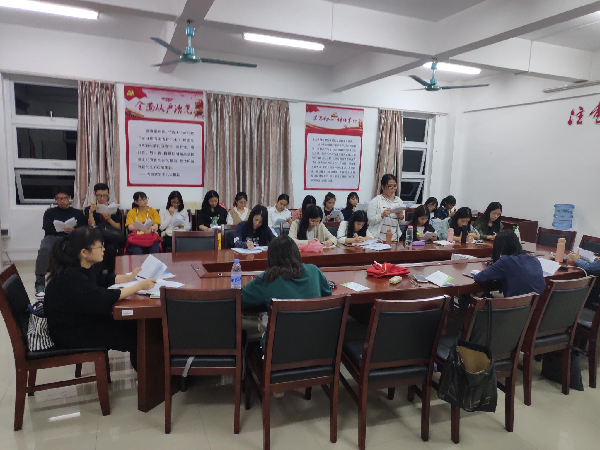 10月30日晚,外国语学院第二党支部在白云校区刘宇新楼313室开展专题党课学习。外国语学院党支部书记周静老师出席本次会议,外国语学院大四党员代表参加会议。会议由周静老师主持。