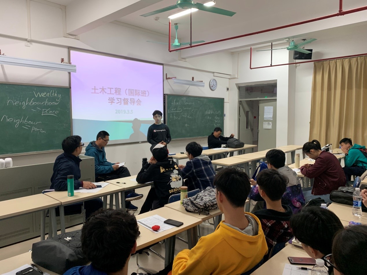3月5日上午,由城乡建设学院组织的“土木工程国际班学习督导会”在白云校区D栋206室进行。城乡建设学院院长卓献荣、党总支副书记刘小海出席了会议,土木工程2017级国际班班主任赵甲荐老师及该班全体同学参加了本次会议。