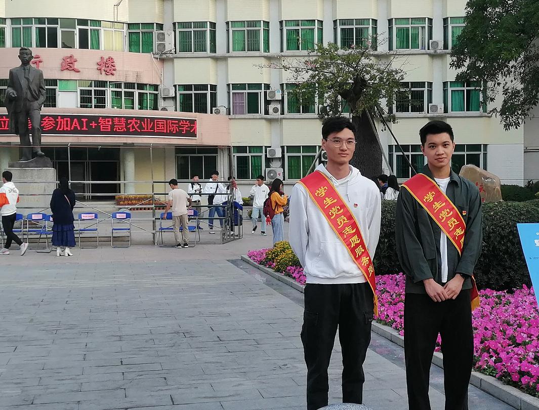 迎着朝阳,一位位党员志愿者身披“信息科学与技术学院学生党员志愿者”红色肩带,佩戴党徽,在各自的岗位上,以诚挚的笑容迎接参会者,以服务的态度为参会者答疑解惑,以实际行动去推动“AI+智慧农业国际学术研讨会”的顺利进行。