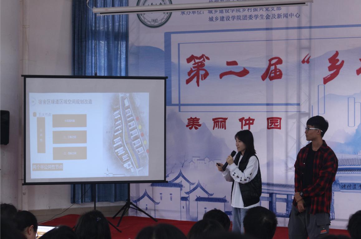 进入此次“乡村振兴杯”设计大赛决赛共有21支队伍。比赛开始时,每个队伍通过PPT展示,向同学们讲解各自的设计理念,部分队伍加以视频和设计图纸来展示,PPT中图文结合,详细地展示出各队伍的设计作品。此次决赛以仲园为设计对象,参赛队伍们从仲园基础建设现状出发,通过前期阶段的问题分析和现场调研,设计出合理的设计理念和改造后的预期模型,将专业知识和创新思维运用到实际改造中去,将“注重实践,扶助农工”的校训落到实处。同时,评委提问、参赛选手答辩环节也让人们了解到更多设计详情。