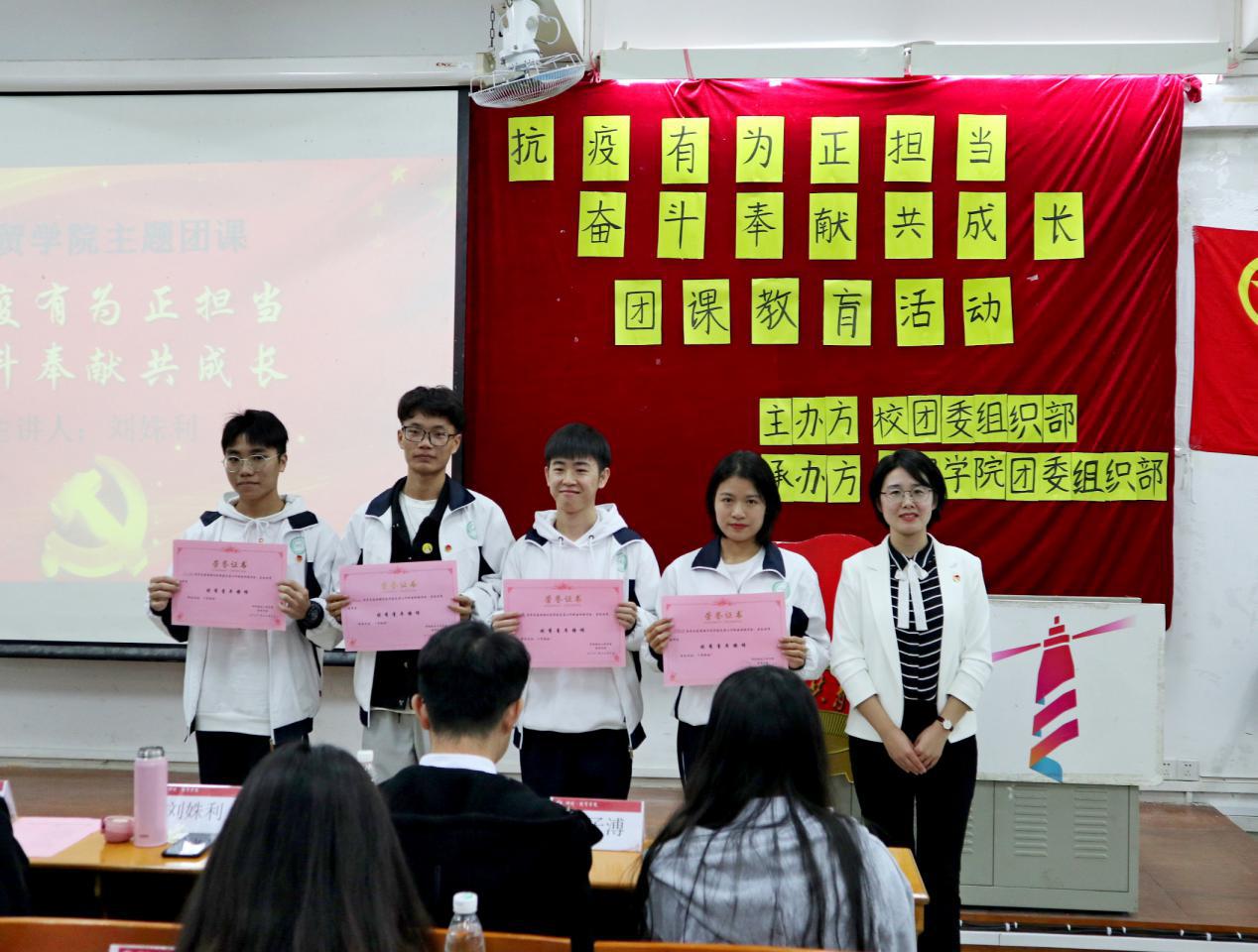 老师发言后,经贸学院优秀抗疫志愿者代表何凯霖、宁敏上台同大家分享抗疫感悟。何凯霖分享了自己在疫情期间的生活、工作情况,表示将继续牢记作为共青团员的担当,在疫情防控发展时期做好各项工作,发挥榜样作用;宁敏表示疫情防控期间在做好自我防护的前提下,应积极回应党组织、团组织的号召,随时为团组织贡献自己的力量。随后,刘姝利老师为优秀抗疫志愿者和优秀青年榜样颁奖。