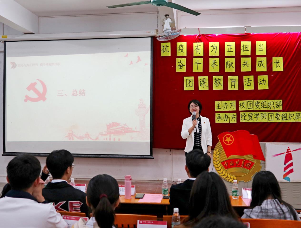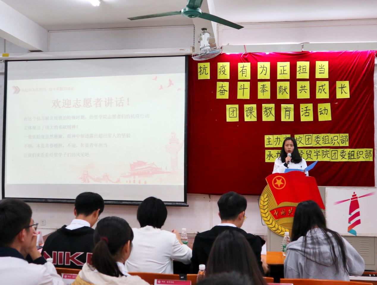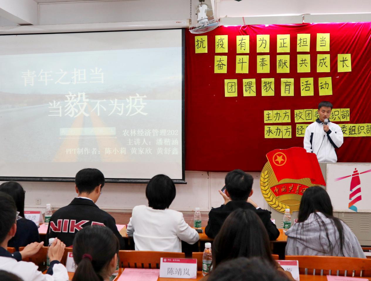 为激励经贸学子在时代的浪潮中不怕苦难、热爱奋斗,不惧牺牲、乐于奉献,心系使命、勇于担当,12月6日晚,经贸学院团委组织部于杨楼210室举办了以“抗疫有为正担当,奋斗奉献共成长”为主题的团课教育活动。经贸学院团委副书记刘姝利,学生干部代表团,优秀抗疫志愿者,校团委组织部代表,各二级学院组织部代表及各班级代表参加了此次活动。团课由刘姝利老师主讲。