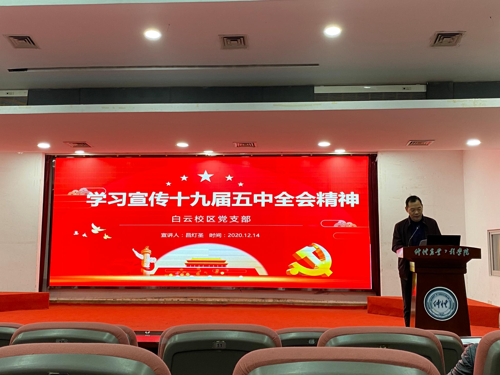 12月14日,白云校区党支部在海珠校区学术报告厅召开党的十九届五中全会精神专题学习会议,支部党员参加会议。会议由支部书记昌灯圣主持。